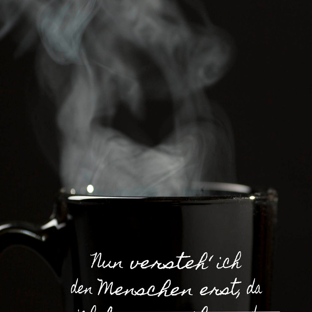Die Hölderlin Portrait Tübingen Tasse ist ein in Schwarz gehaltener Kaffeebecher, verziert mit einem eindrucksvollen Portrait von Friedrich Hölderlin. Auf der Tasse prangt seine Unterschrift sowie der literarische Spruch: "Nun versteh ich den Menschen Hinweise: Fassungsvermögen: ca. 300ml