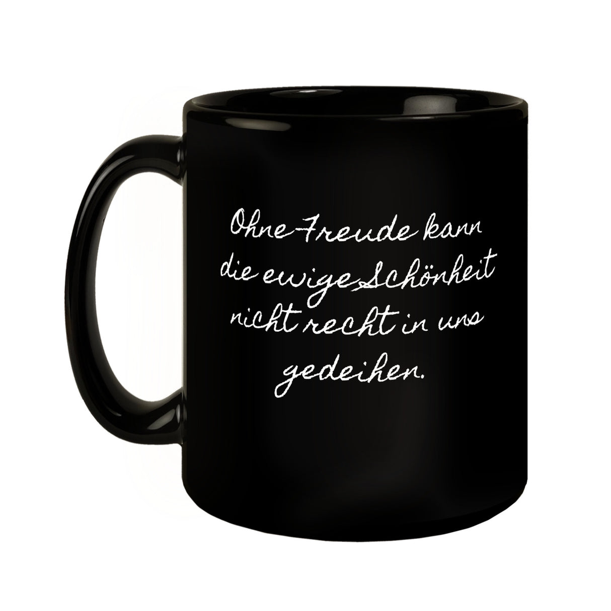 • Diese stilvolle Kaffeetasse ist ganz in Schwarz gehalten und präsentiert ein eindrucksvolles Porträt von Hölderlin. Abgerundet wird das Design mit seiner Unterschrift und dem inspirierenden Spruch: "Ohne Freude kann die ewige Schönheit nicht recht in uns gedeihen." Elegant und zeitlos, perfekt für jeden Schreibtisch oder Küchentisch.