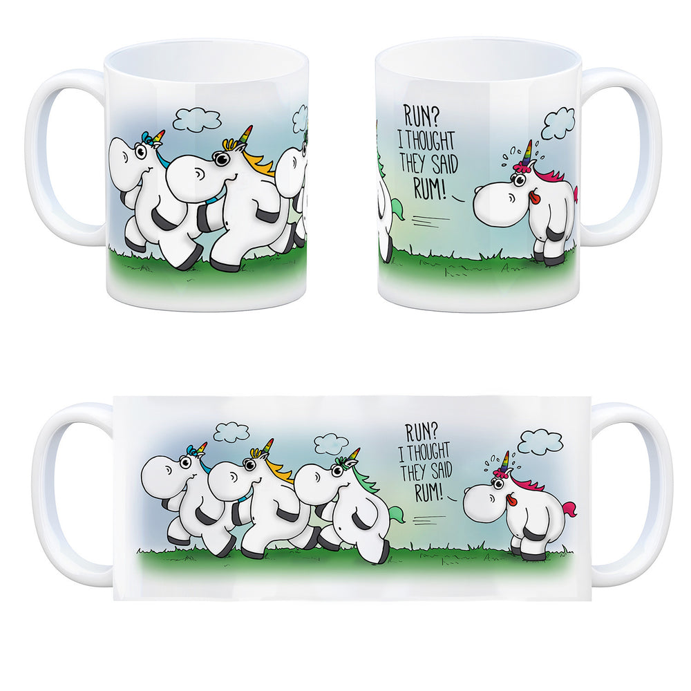 Honeycorns Kaffeebecher mit Einhorn Motiv und Spruch: RUN? I thought they said RUM!