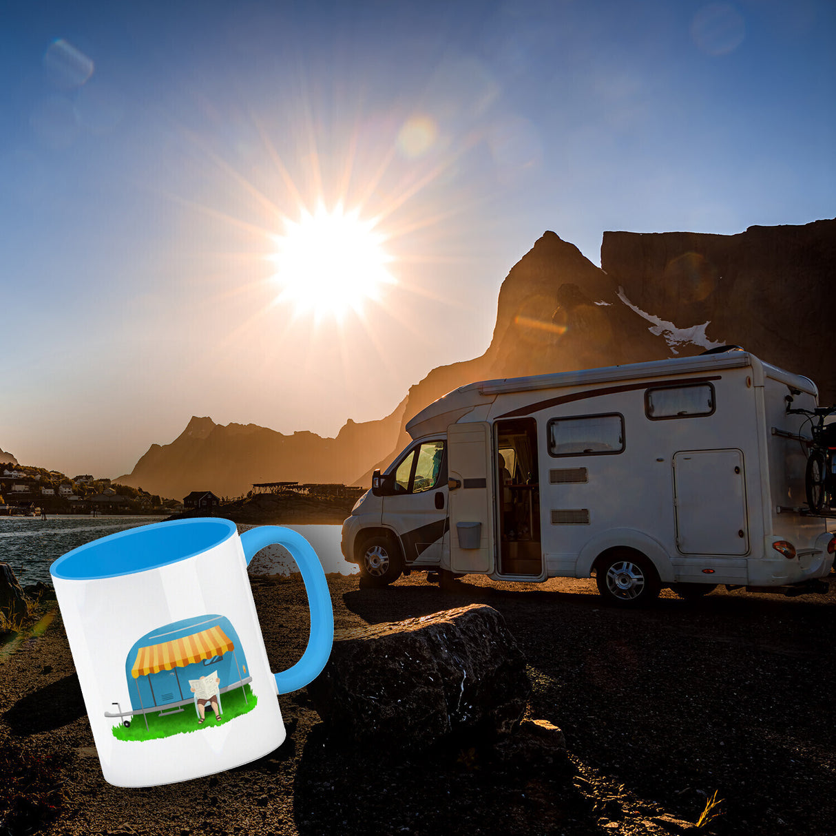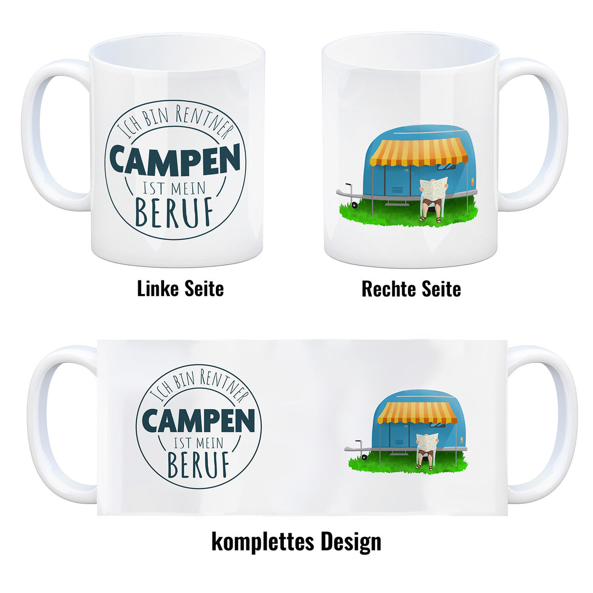 - 1x Ich bin Rentner Campen ist mein Beruf Kaffeebecher mit Wohnwagen in der gewählten Ausführung
