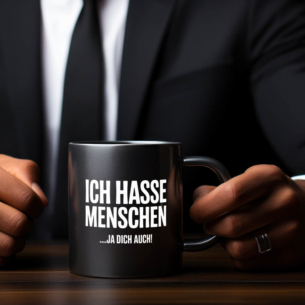 - Diese Tasse hat ein kraftvolles schwarz-weißes Textdesign. Mit den auffälligen großen Buchstaben "ICH HASSE MENSCHEN" und dem subtilen "... ja dich auch!" darunter, zieht sie alle Blicke auf sich. Das minimalistische Design bietet eine rebellische und humorvolle Note, perfekt für alle, die gerne mit einem Augenzwinkern provozieren.