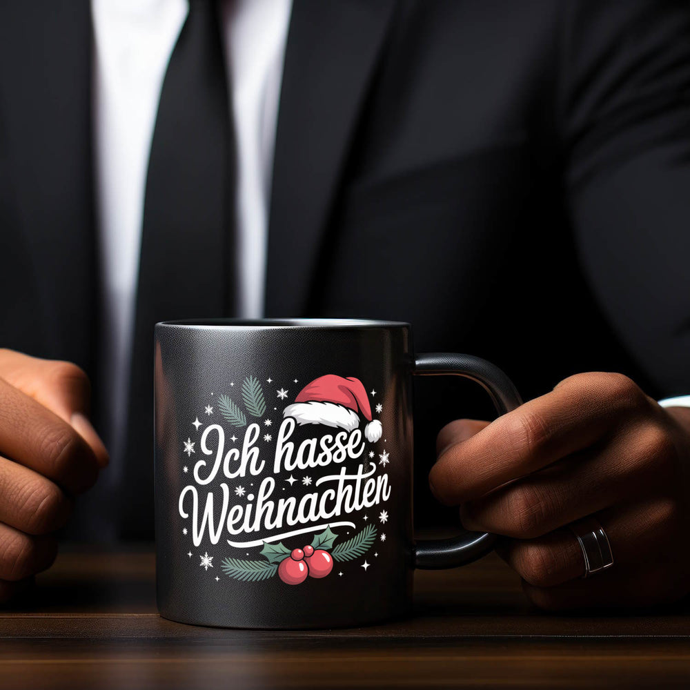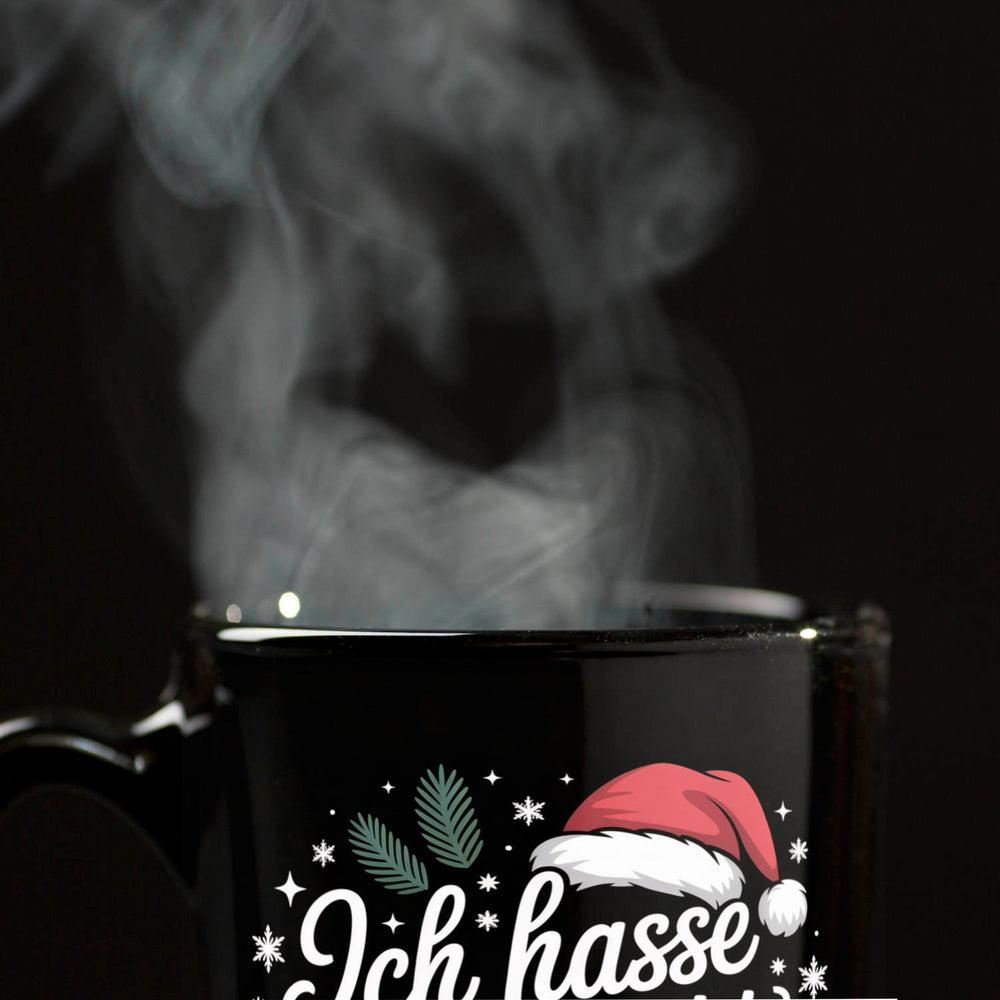 - Die "Ich hasse Weihnachten"-Tasse ist ein humorvoller Hingucker! Mit ihrem schwarzen Hintergrund hebt sich das stilvolle Design hervor: ein digital illustrierter Weihnachtsmannhut in Rot und Weiß, umgeben von Schneeflocken, Sternen und grünen Tannenzweigen mit roten Beeren. Der weiße Schriftzug in Schreibschrift verleiht einen besonderen Charme. Einfach ein festlicher Blickfang!