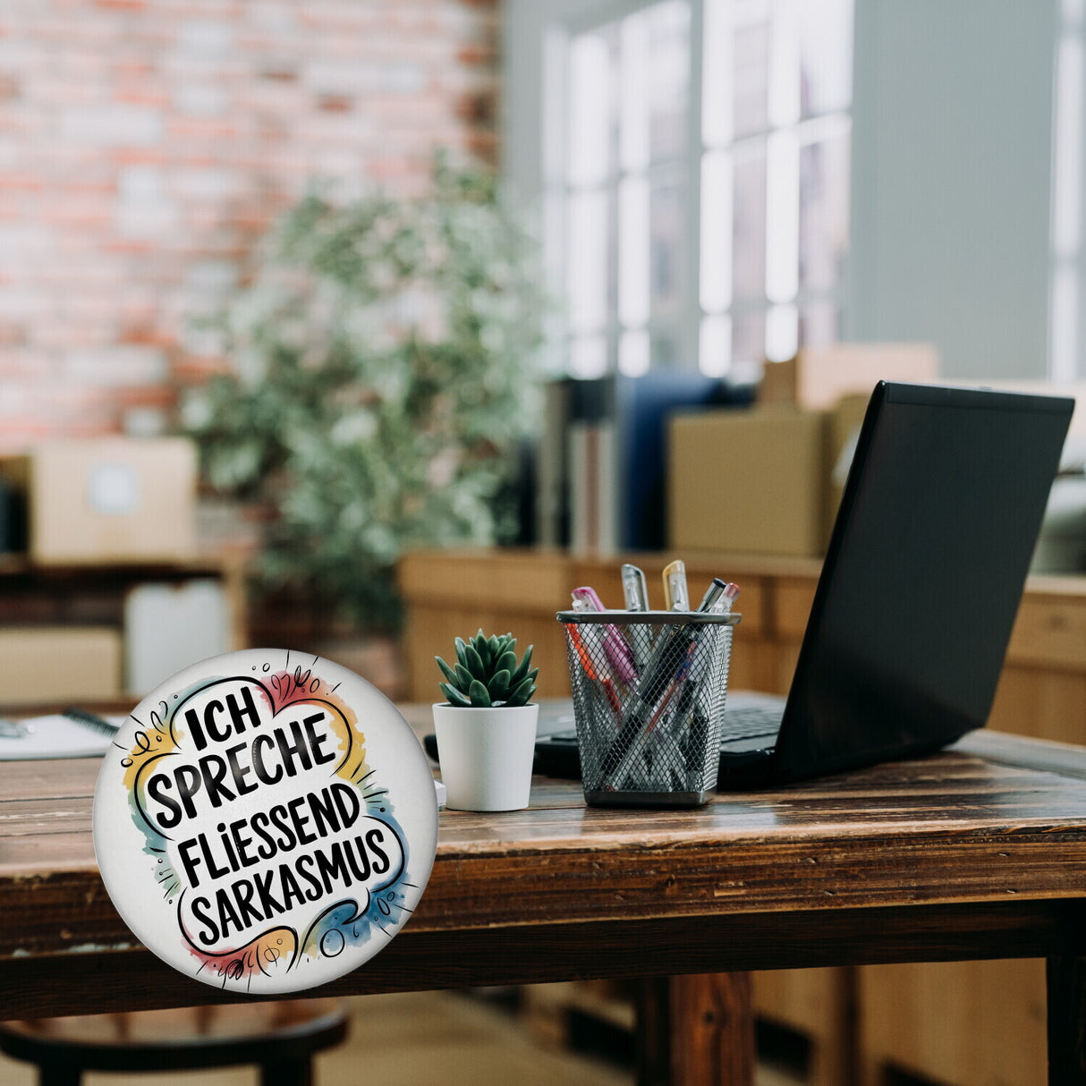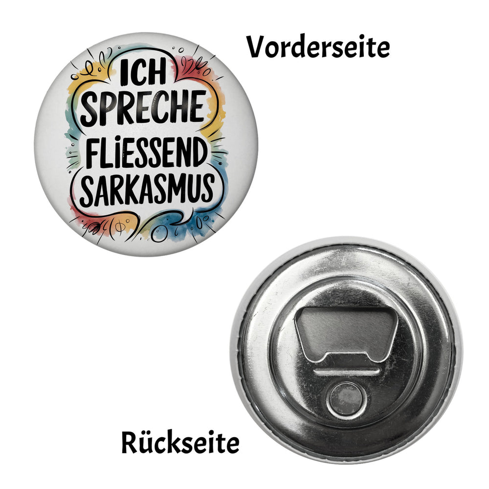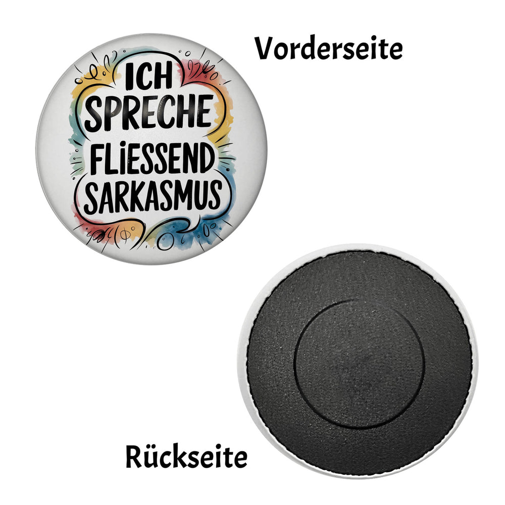 - Dieser runde Magnet ist ein wahres Kunstwerk für Humorliebhaber! Auf weißem Hintergrund strahlt eine Sprechblase mit der kessen Aufschrift "ICH SPRECHE FLIESSEND SARKASMUS" in fetten, schwarzen Buchstaben. Umgeben von bunten Aquarellspritzern in Gelb, Blau, Rot und detailverliebten Kritzeleien, sorgt er für einen humorvollen Hingucker.