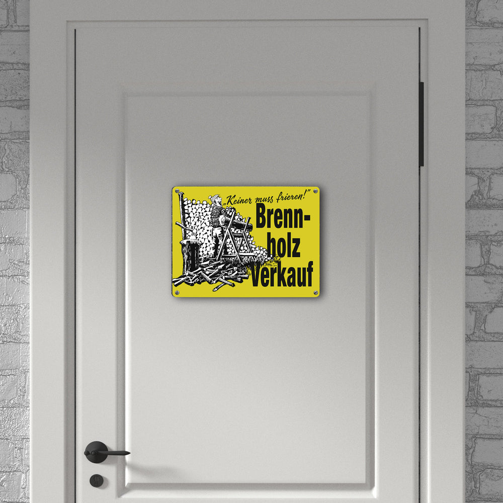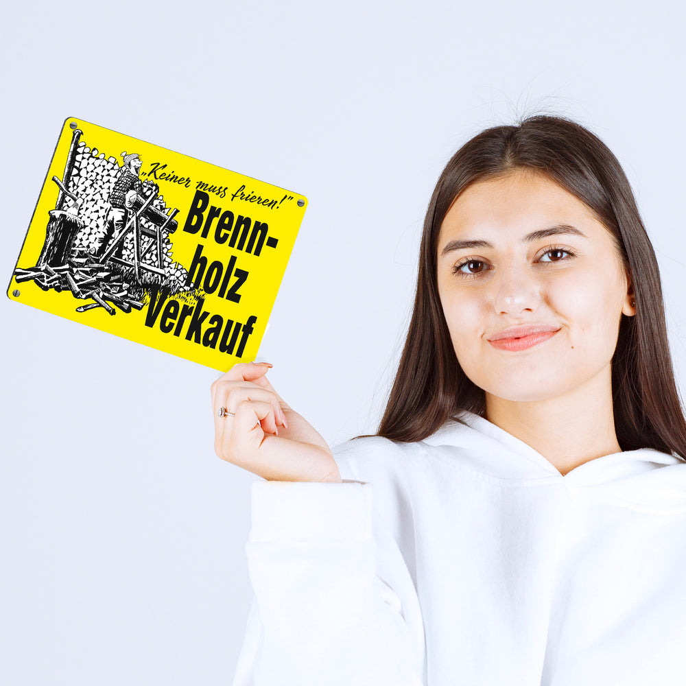 Brennholzverkauf. Niemand muss frieren! Metallschild in 15x20 cm