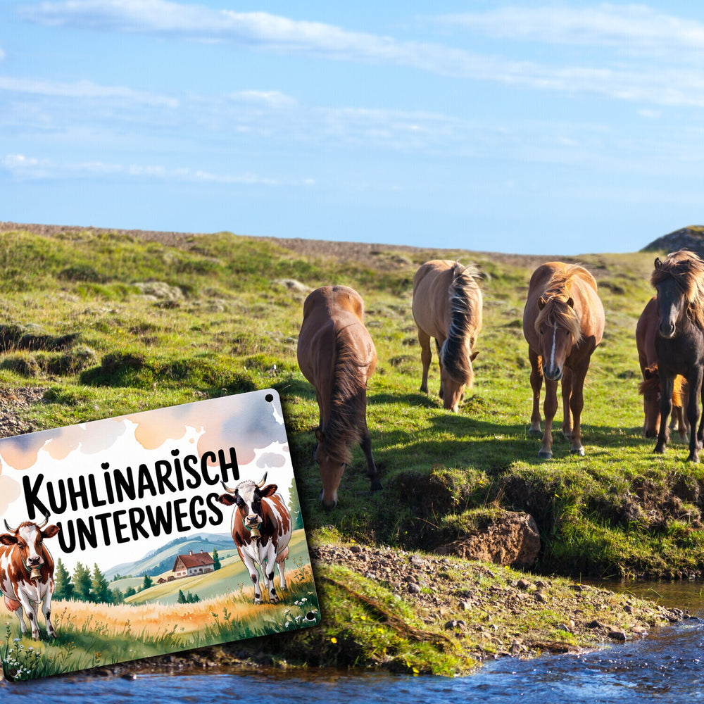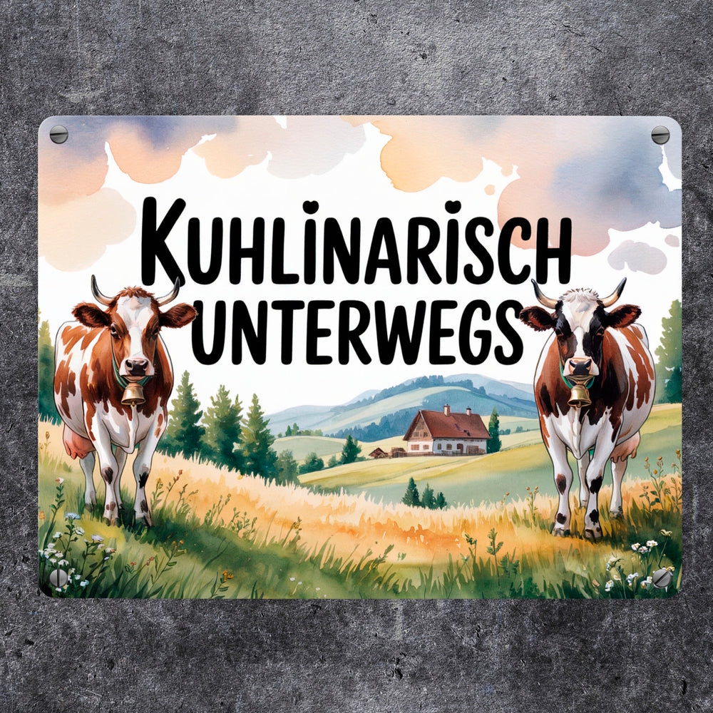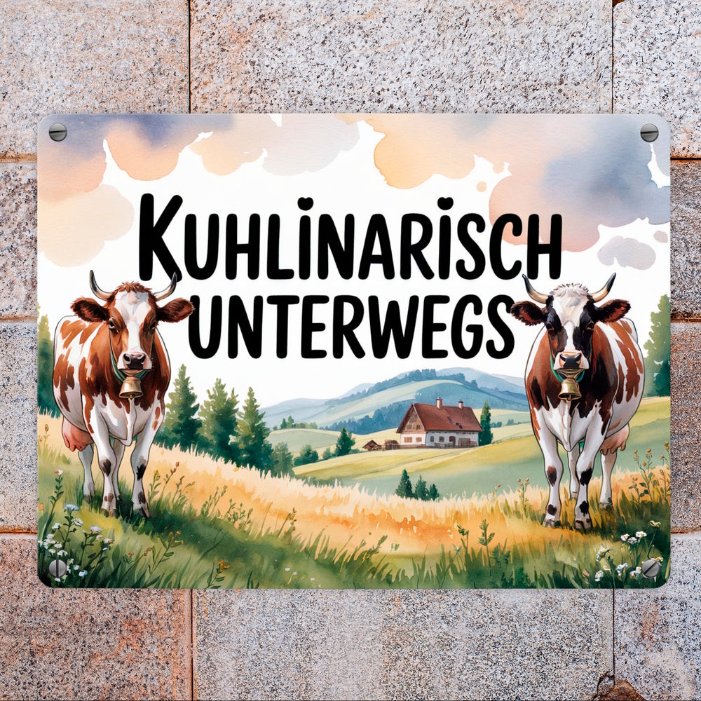 • Das Metallschild "Kuhlinarisch Unterwegs" präsentiert ein bezauberndes Aquarellbild von zwei fröhlichen Allgäuer Kühen, die sanft auf saftigem Grün grasen. Ihre braun-weißen Flecken und sanft klingenden Glocken ergänzen den charmanten Spruch. Der Hintergrund zeigt sanfte Hügel, Wildblumen und ein traditionelles Bauernhaus im warmen Licht der Nachmittagssonne.