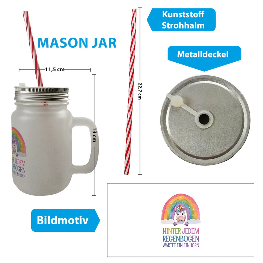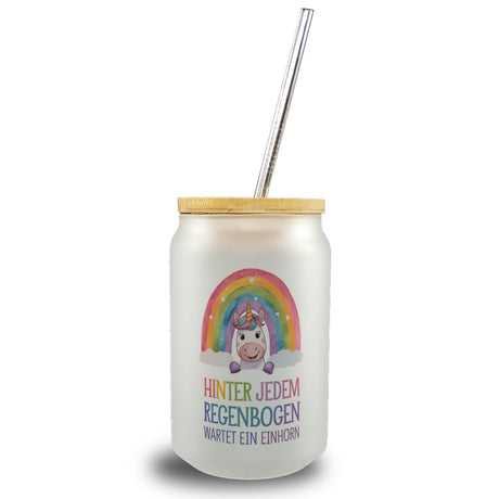 - 1x Lächelndes Einhorn Trinkglas mit Bambusdeckel Hinter jedem Regenbogen mit Bambusdeckel oder Henkel