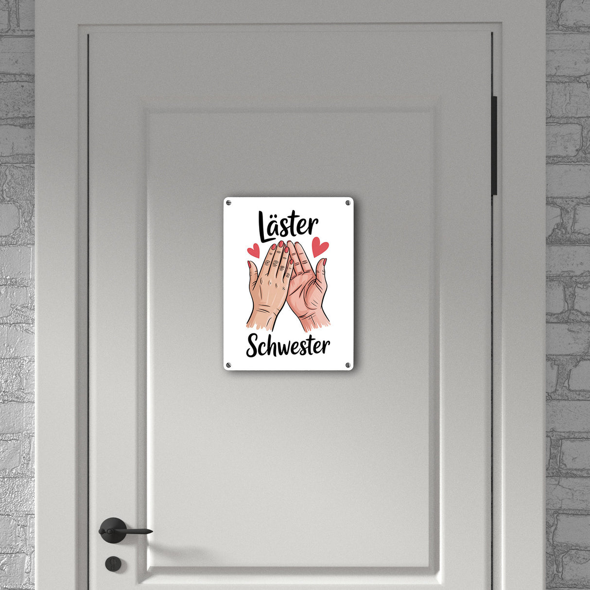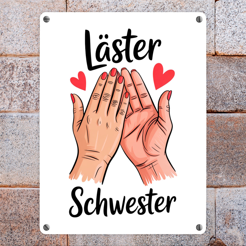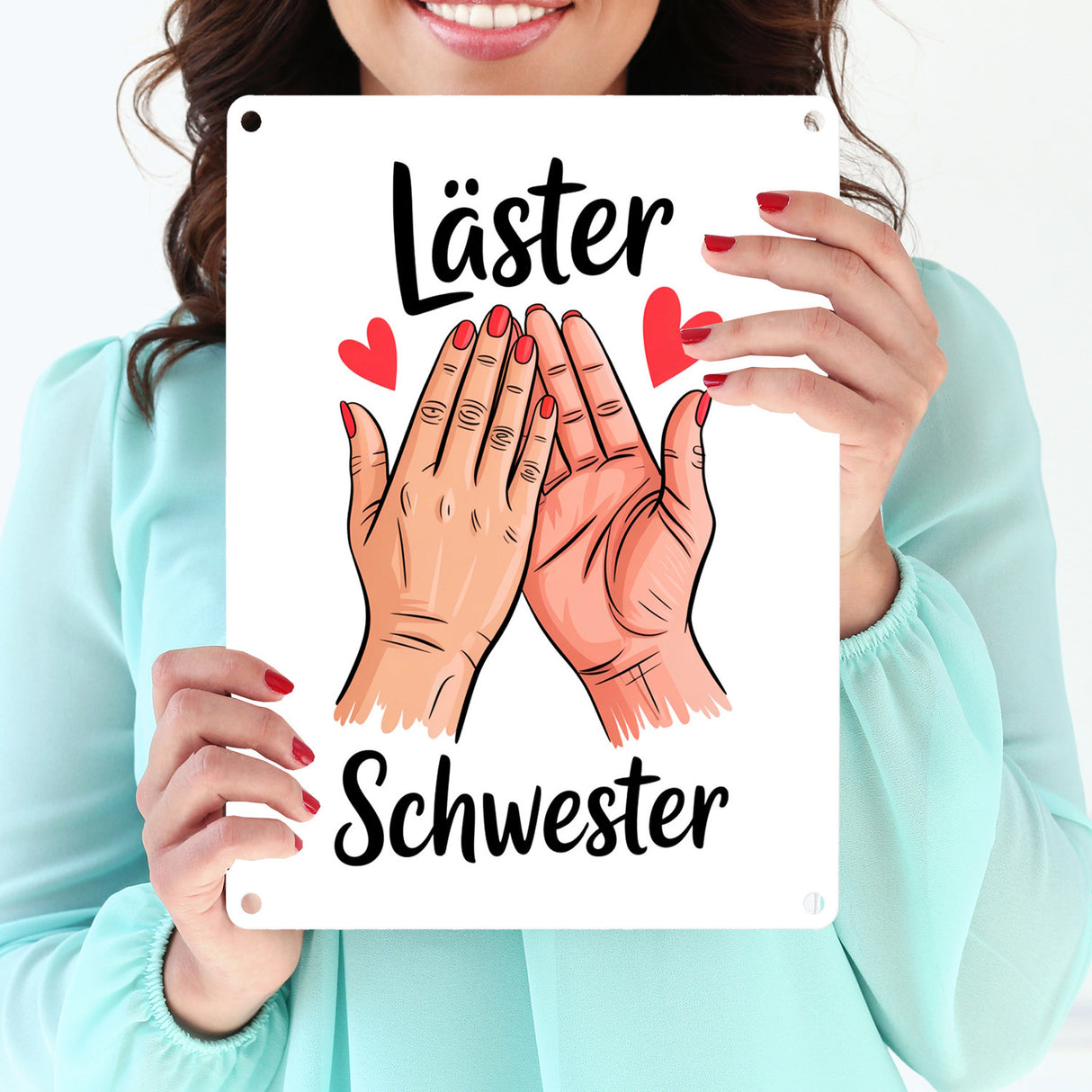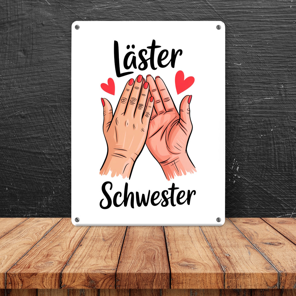 - Hol dir das Läster Schwester Metallschild, liebevoll designt und in bester Qualität bedruckt! Eine witzige Deko für dich und deine beste Freundin, die jeden Raum verschönert und zum Schmunzeln bringt. Ideal zum Verschenken oder Selbstbehalten. Ein Must-have für alle Freundinnen mit lässigem Humor!