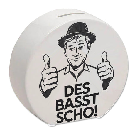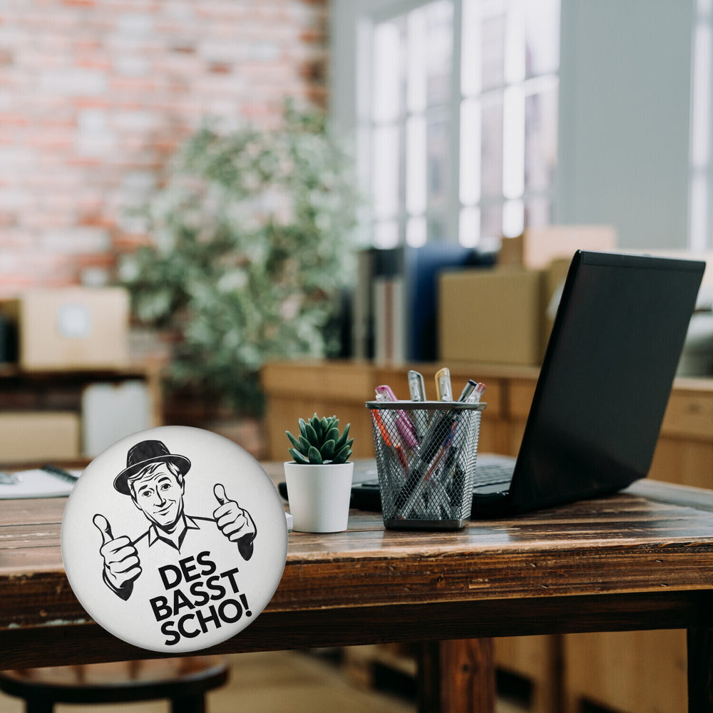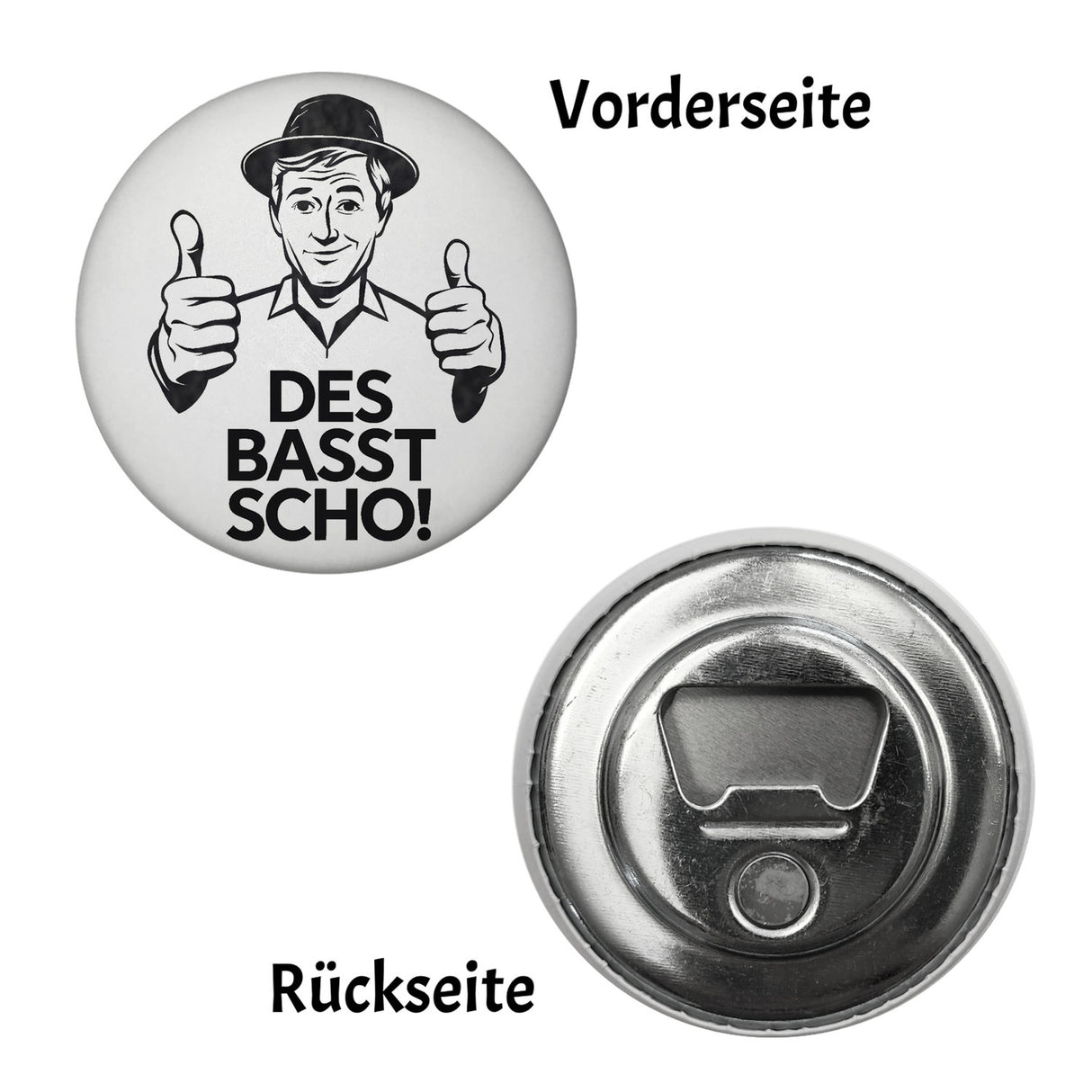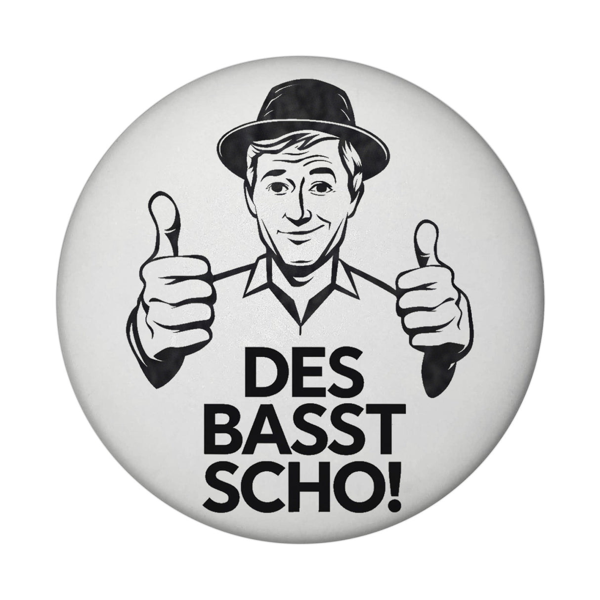 - Dieser runde Magnet zeigt einen lässigen Mann mit Hut, der mit beiden Daumen nach oben zeigt und zwinkert. Eine schwarz-weiße Illustration auf weißem Hintergrund, veredelt mit dem bayerischen Spruch "DES BASST SCHO!". Perfekt für alle, die Gelassenheit und Humor lieben.