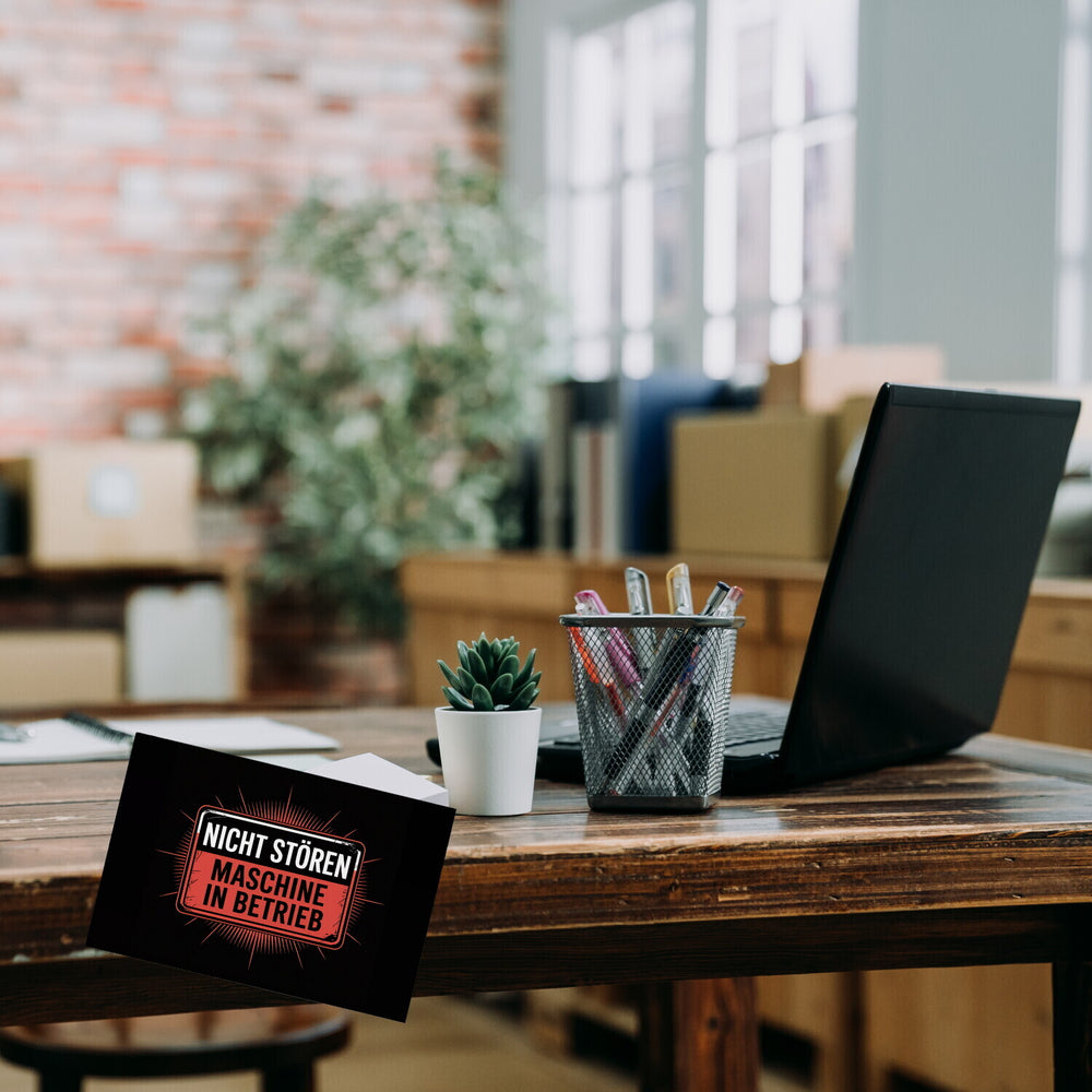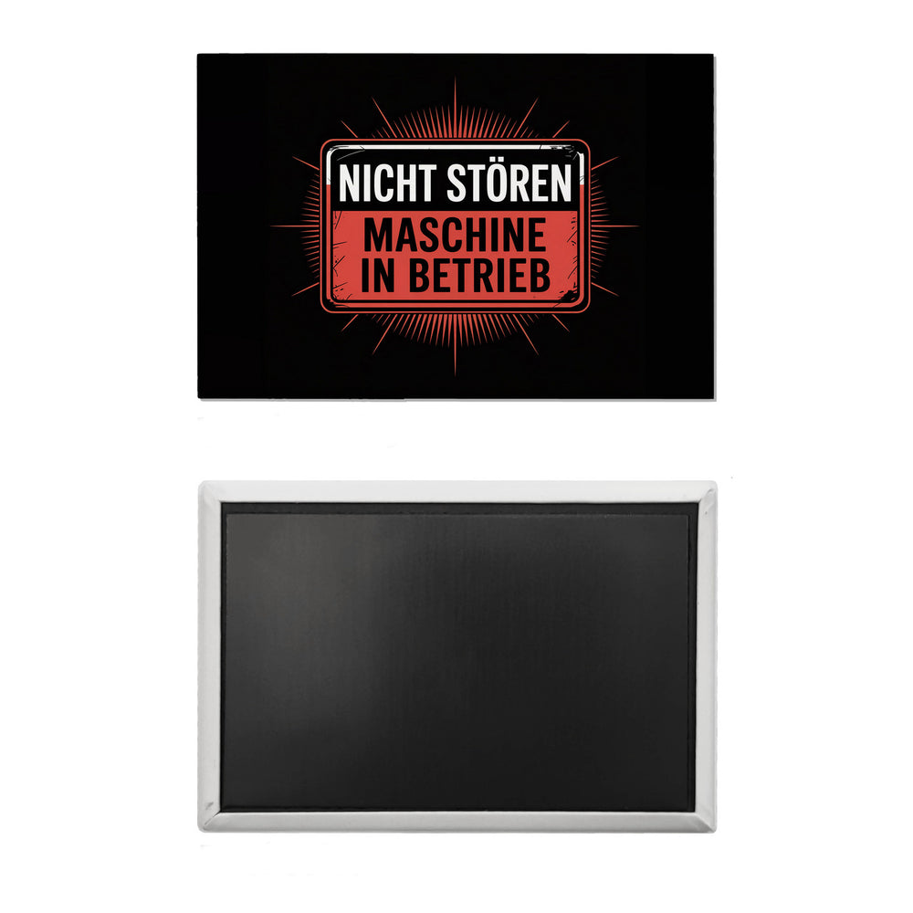 Der Maschine in Betrieb Souvenir Magnet beeindruckt mit seinem starken, industriellen Design. Ein tiefschwarzer Hintergrund kontrastiert mit einem schwarz-roten Warnschild, das "NICHT STÖREN" und "MASCHINE IN BETRIEB" in großen weißen und Hinweise: Größe: ca. 8x5,5 cm