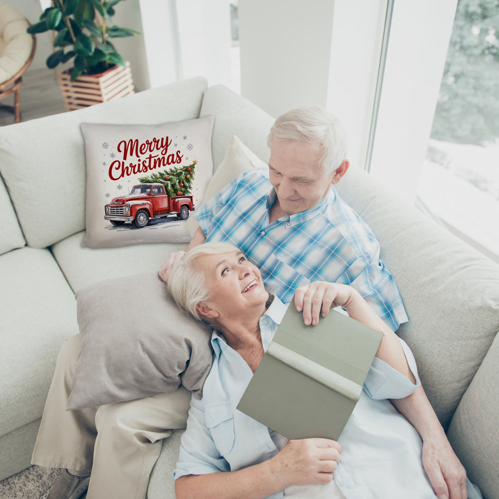 • 1x Merry Christmas Kissen mit Rotem Truck und Weihnachtsbaum in der gewählten Ausführung