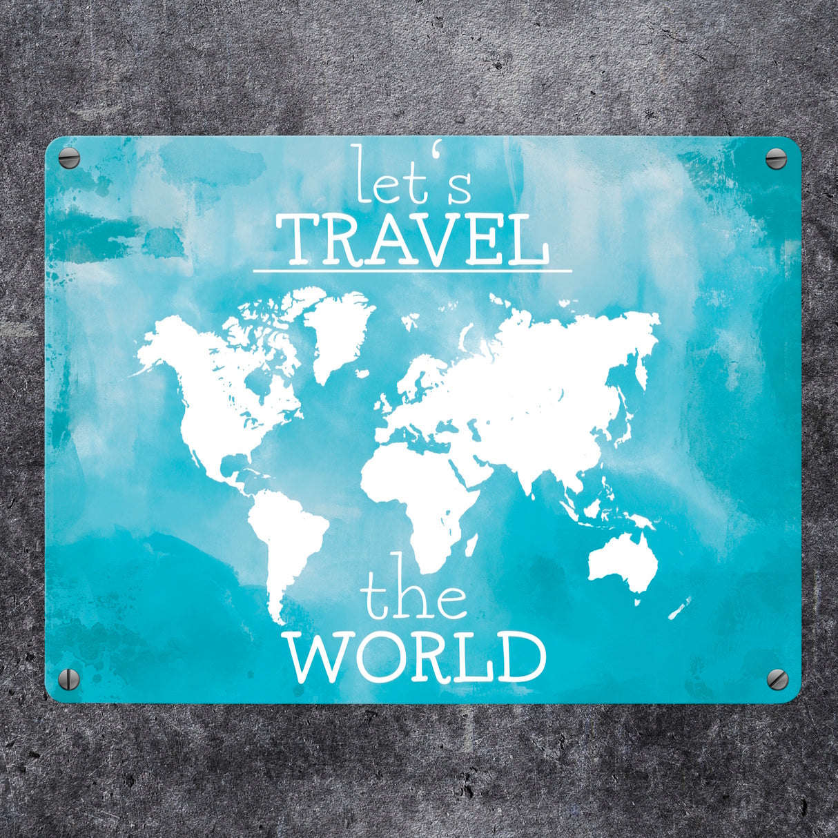 • 1x Metallschild mit Weltkarte und Spruch - let's travel the world in der gewählten Größe