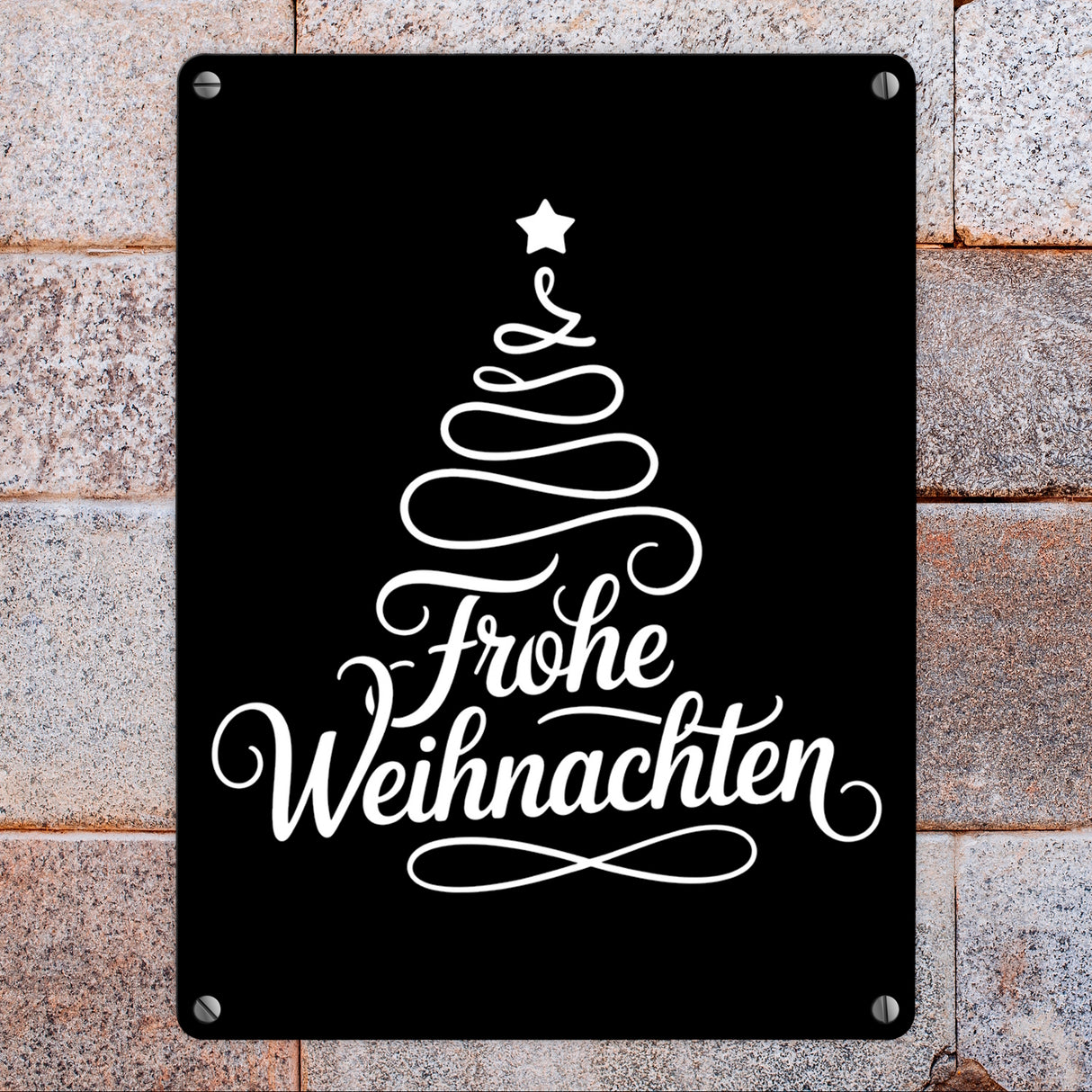 - Das minimalistische Metallschild präsentiert einen stilisierten weißen Weihnachtsbaum auf tiefschwarzem Hintergrund. Der Baum besteht aus eleganten, spiralförmigen Linien, die von einem Stern gekrönt werden. Darunter ist der festliche Schriftzug "Frohe Weihnachten" in dekorativer Kalligrafie. Ein starker Kontrast und die elegante Schlichtheit machen dieses Design besonders ansprechend.
