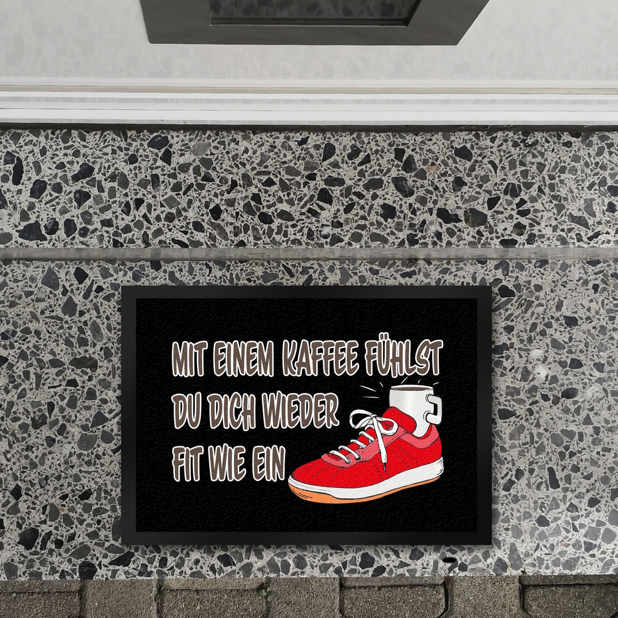 - Diese witzige Fußmatte zeigt einen gezeichneten roten Turnschuh, aus dem ein Kaffeebecher ragt. Der freche Spruch "Mit Kaffee fühlst du dich fit" verspricht jedem Besucher ein Lächeln. Perfekt für alle, die ihren Humor gerne schon an der Tür zeigen und zeigen wollen, dass Kaffee ihre Geheimwaffe ist.