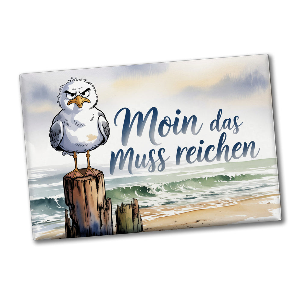 Der eckige Magnet zeigt eine herrlich mürrische Cartoon-Möwe, die auf einem mit Seepocken bedeckten Holzpfahl sitzt. Mit ihrem unzufriedenen Gesichtsausdruck und der Botschaft "Moin das muss reichen" bringt sie den maritimen Humor perfekt zur Gelt Hinweise: Größe: ca. 8x5,5 cm