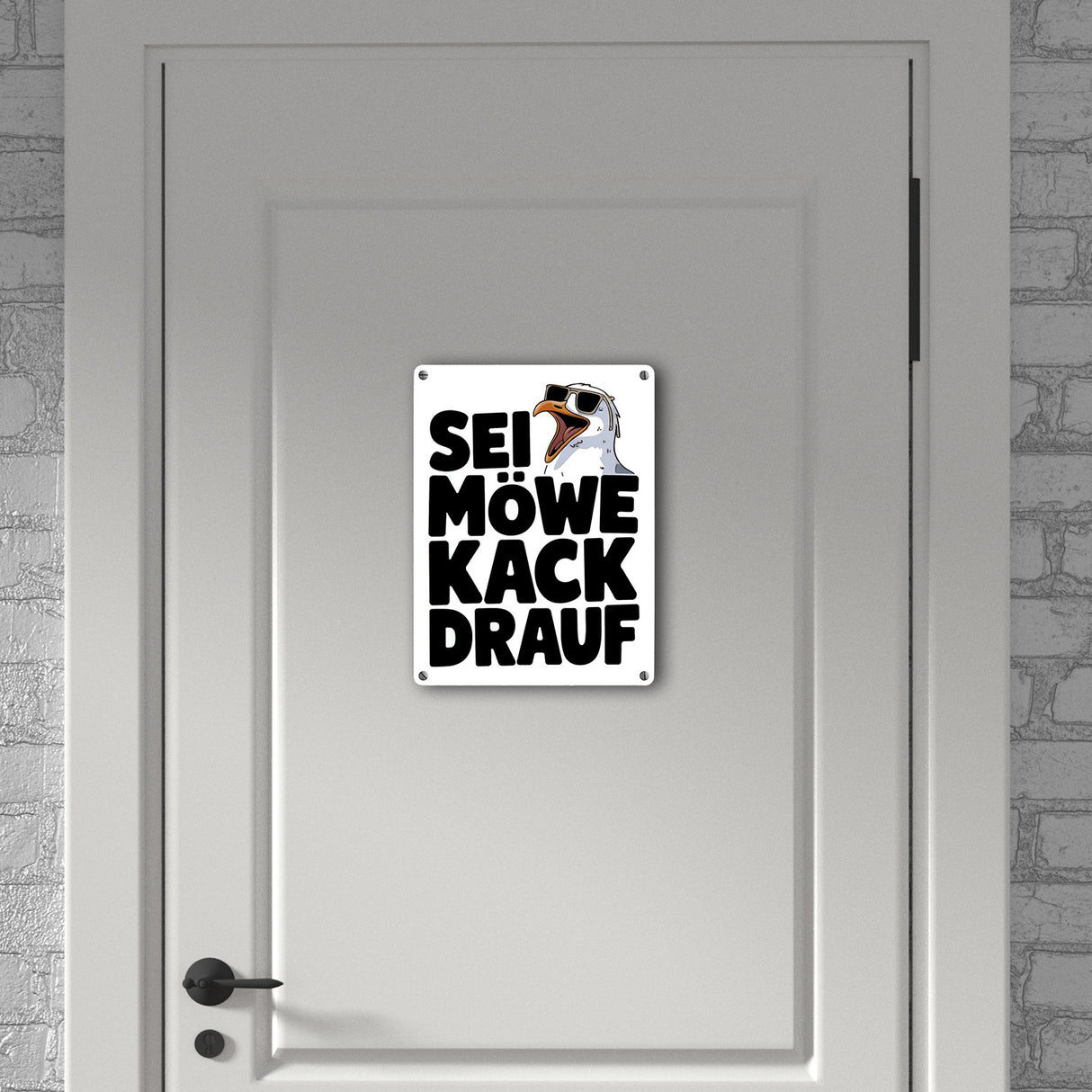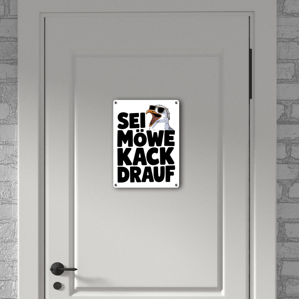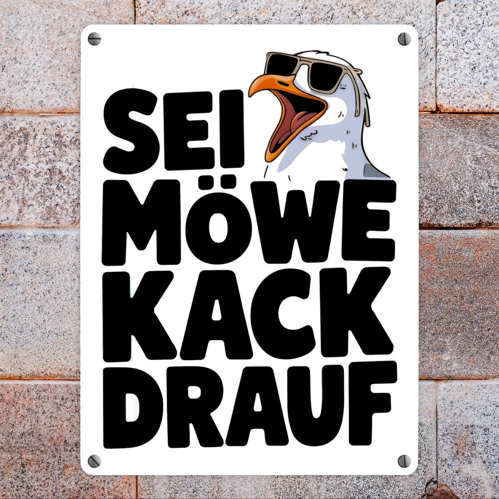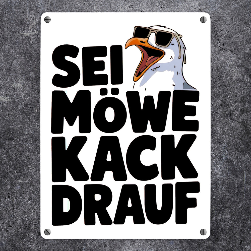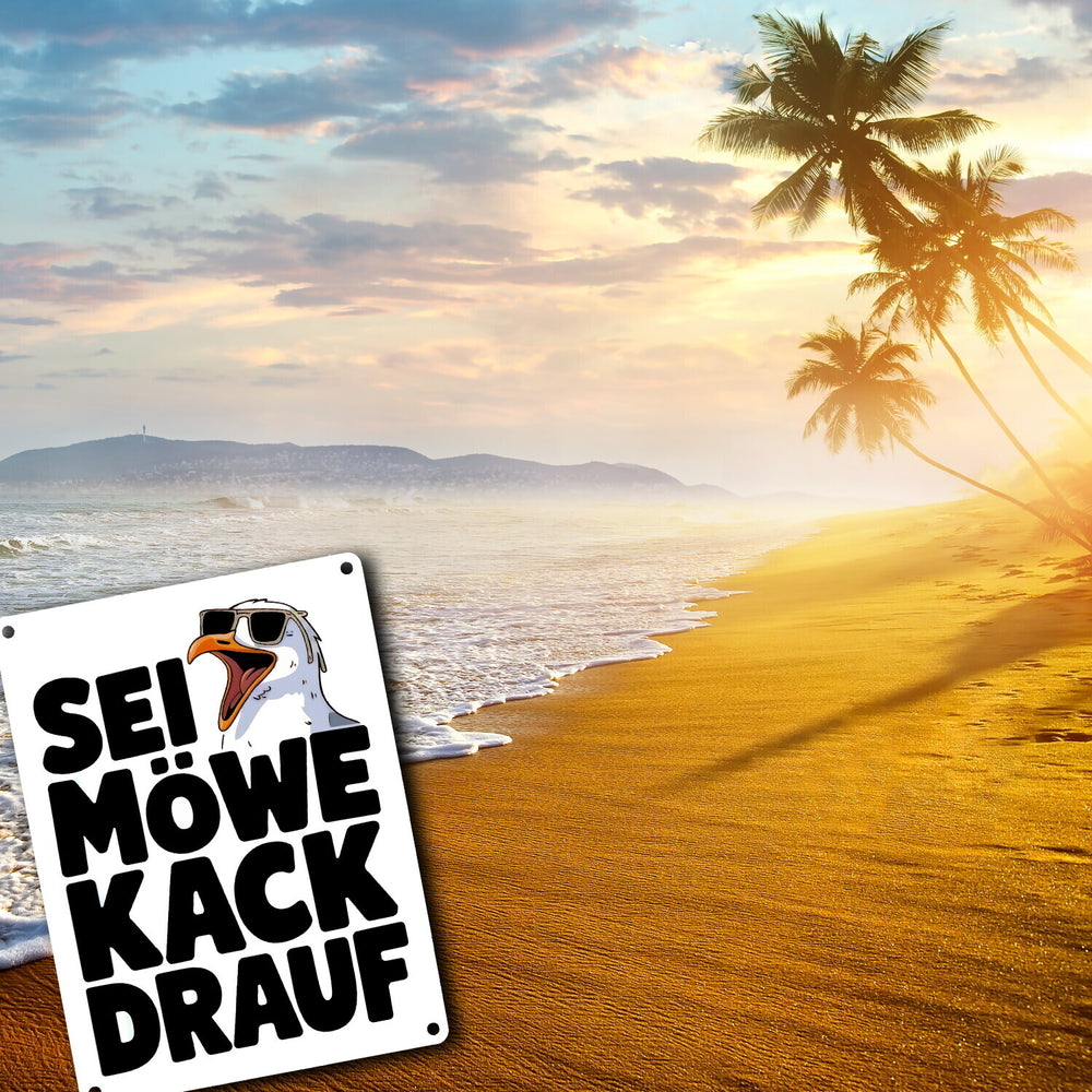 • Dieses lustige Metallschild zeigt eine große Möwe mit Sonnenbrille und offenem Schnabel auf einem weißen Hintergrund. Der witzige Spruch "SEI MÖWE kack drauf" darunter vermittelt einen unbeschwerten, humorvollen Ton. Perfekt für Möwenliebhaber, die einen Hauch Strandhausdeko in ihr Zuhause bringen möchten.