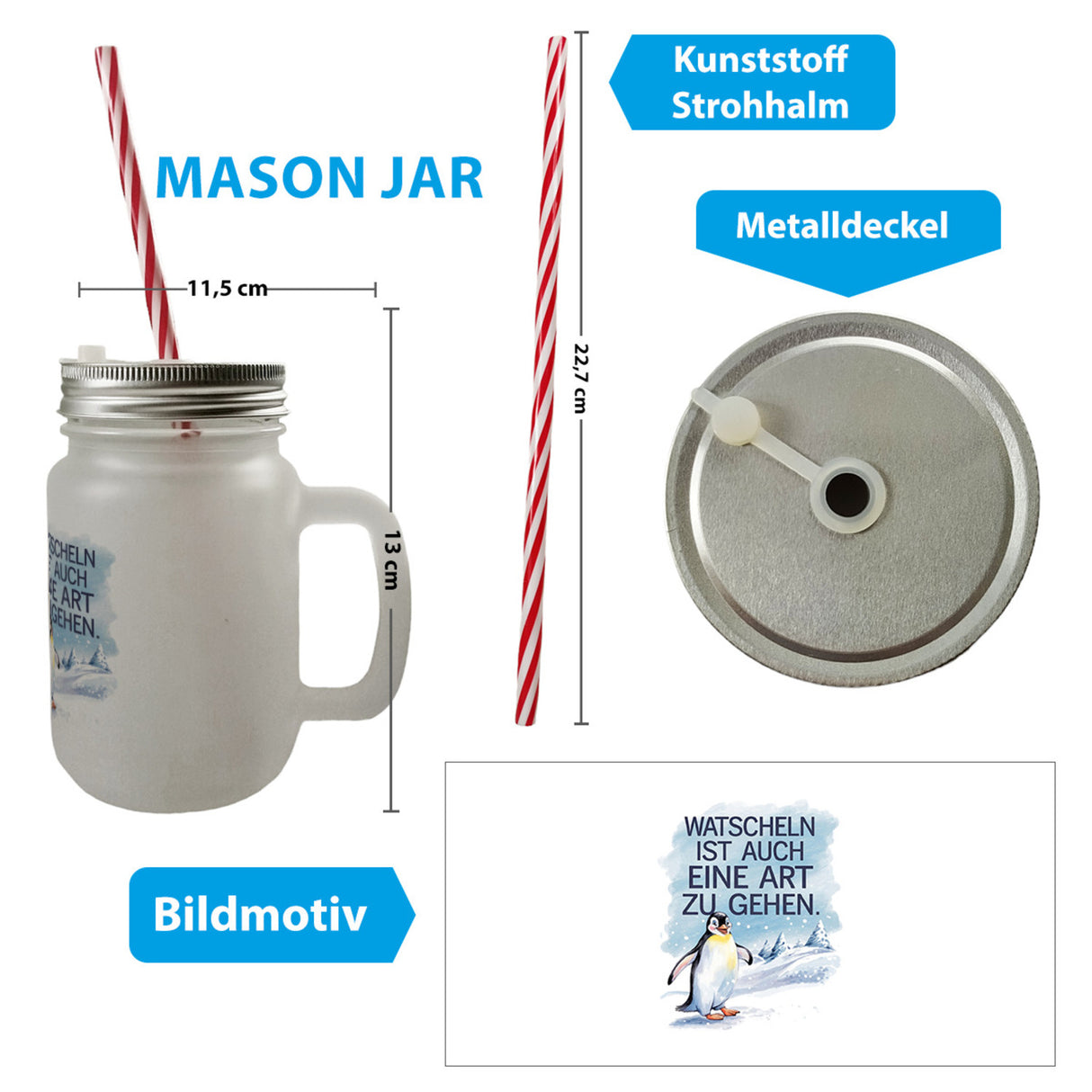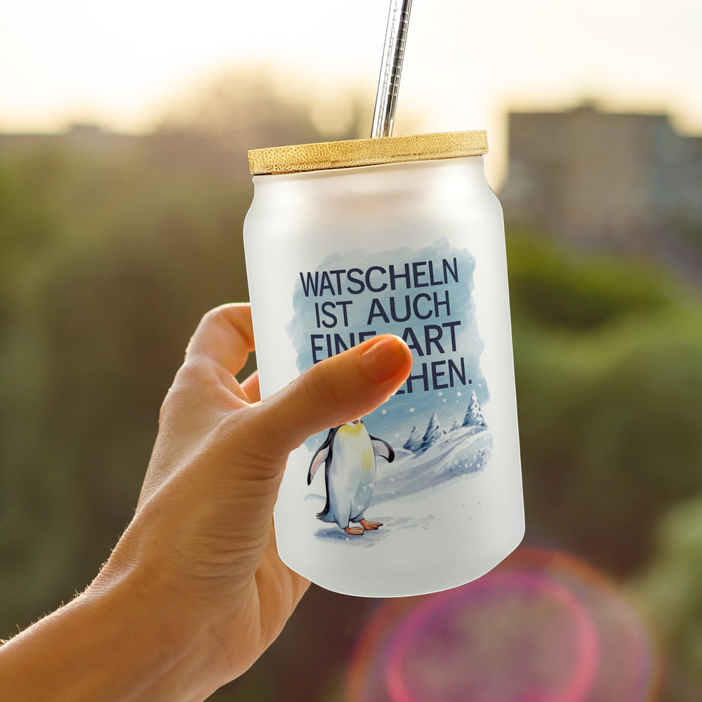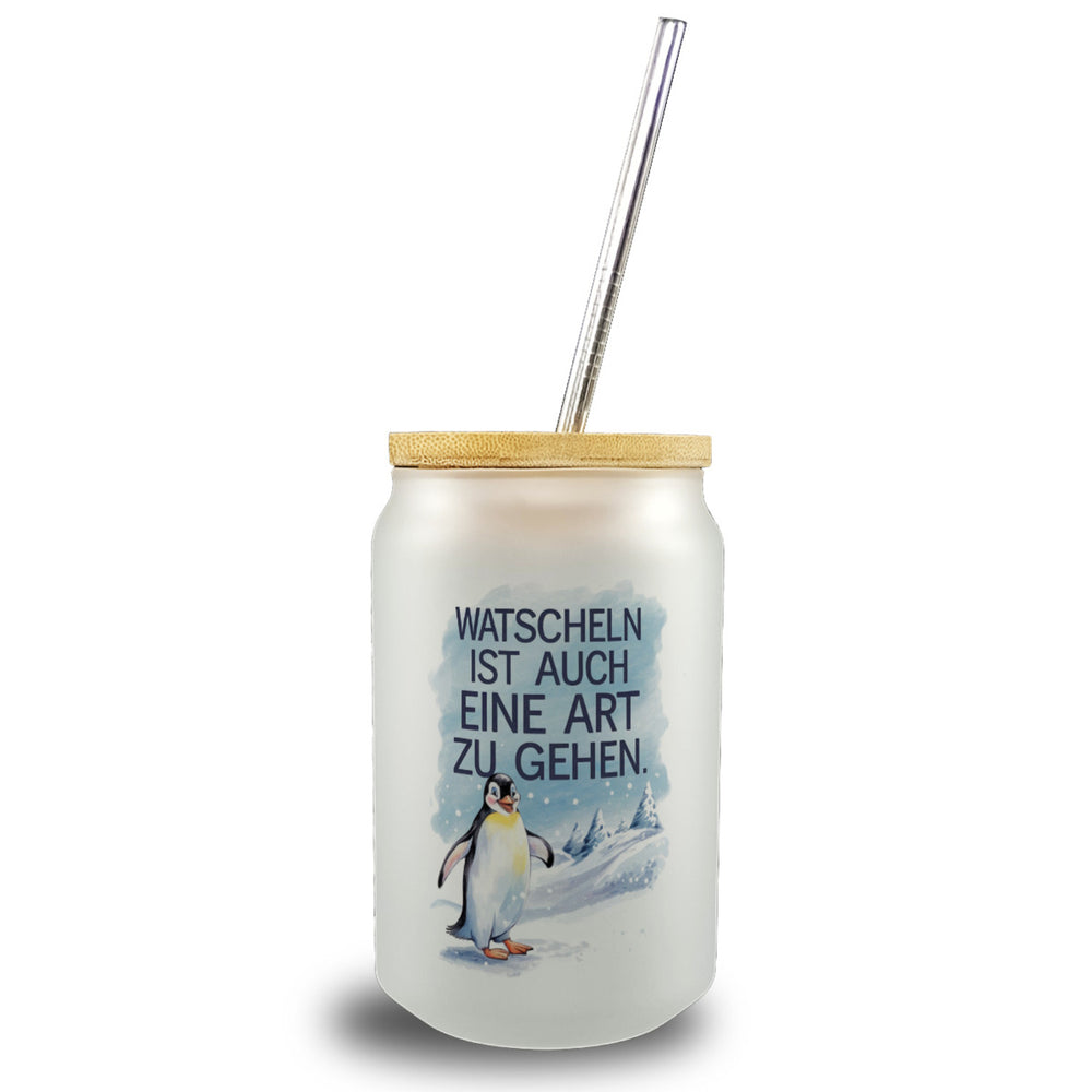 Niedlicher Pinguin Watschelt Trinkglas mit Bambusdeckel Watscheln ist auch Gehen