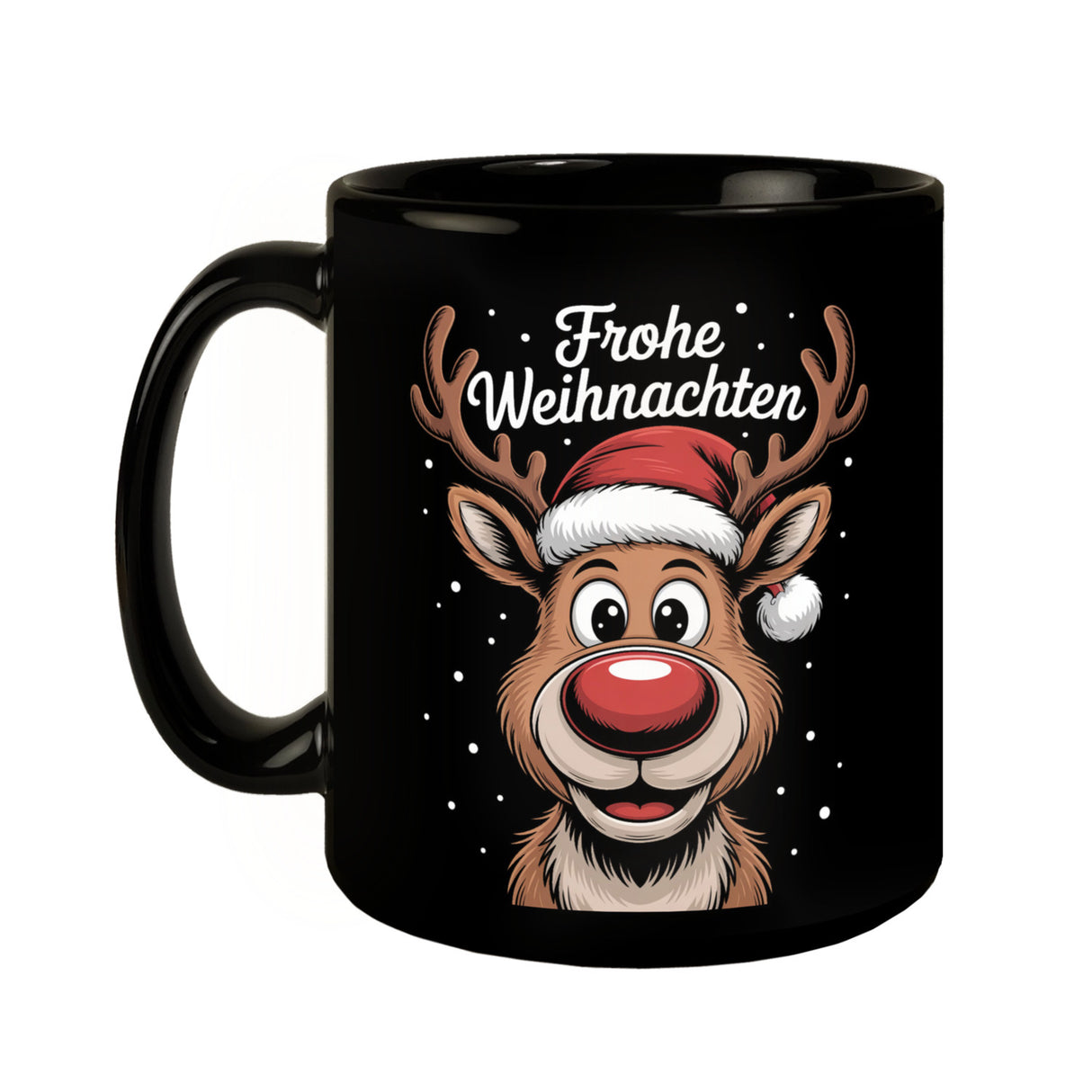 - Diese schwarze Weihnachtstasse ist ein echter Hingucker! Mit einem fröhlichen Rentier mit roter Nase und Weihnachtsmütze zaubert sie jedem ein Lächeln ins Gesicht. Der Text "Frohe Weihnachten" in weißer Schreibschrift rundet das Design ab. Schneeweiße Punkte im Hintergrund machen die festliche Stimmung perfekt.