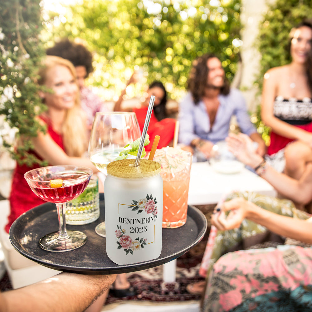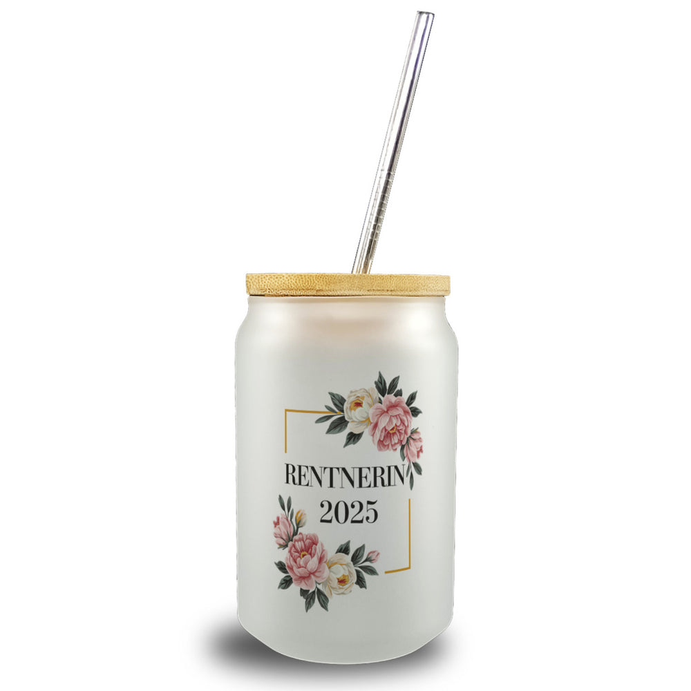 Rentnerin 2025 Blumen Trinkglas mit Bambusdeckel für den Ruhestand