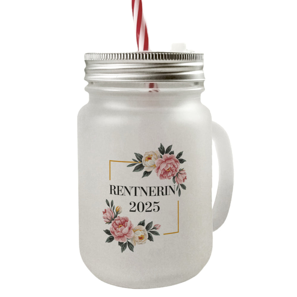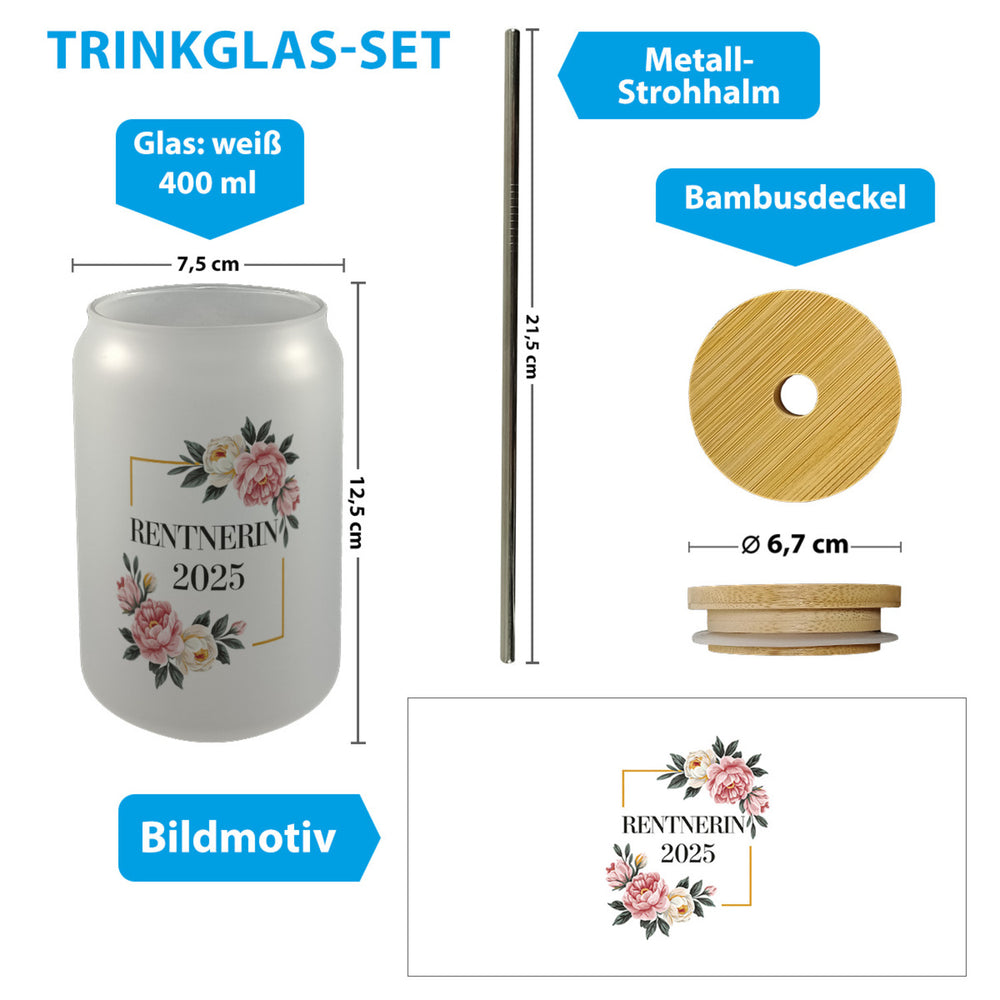 - 1x Rentnerin 2025 Blumen Trinkglas mit Bambusdeckel für den Ruhestand mit Bambusdeckel oder Henkel