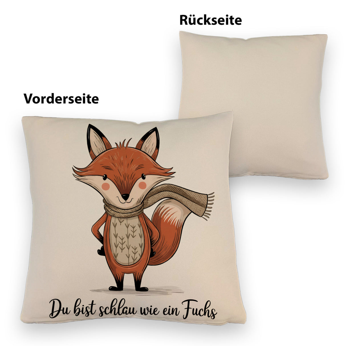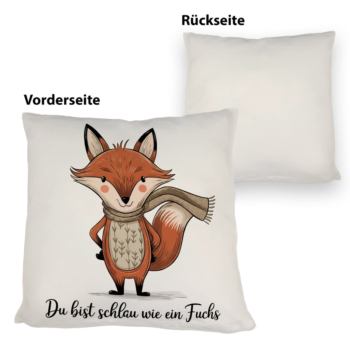 - Entdecke das bezaubernde "Schlauer Fuchs"-Kissen! Mit einer animierten Illustration einer liebenswerten Fuchsfigur, die einen drapierten Schal trägt, bringt dieses Kissen Freude in dein Zuhause. Witzige Sprüche wie "Du bist schlau wie ein Fuchs" machen es zu einem perfekten Geschenk!