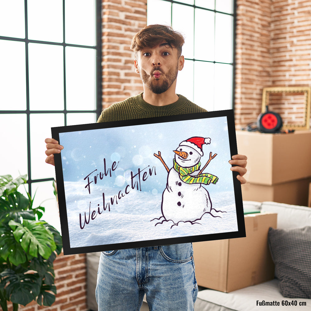 Schneemann mit Mütze Fußmatte in 35x50 cm mit Spruch Frohe Weihnachten