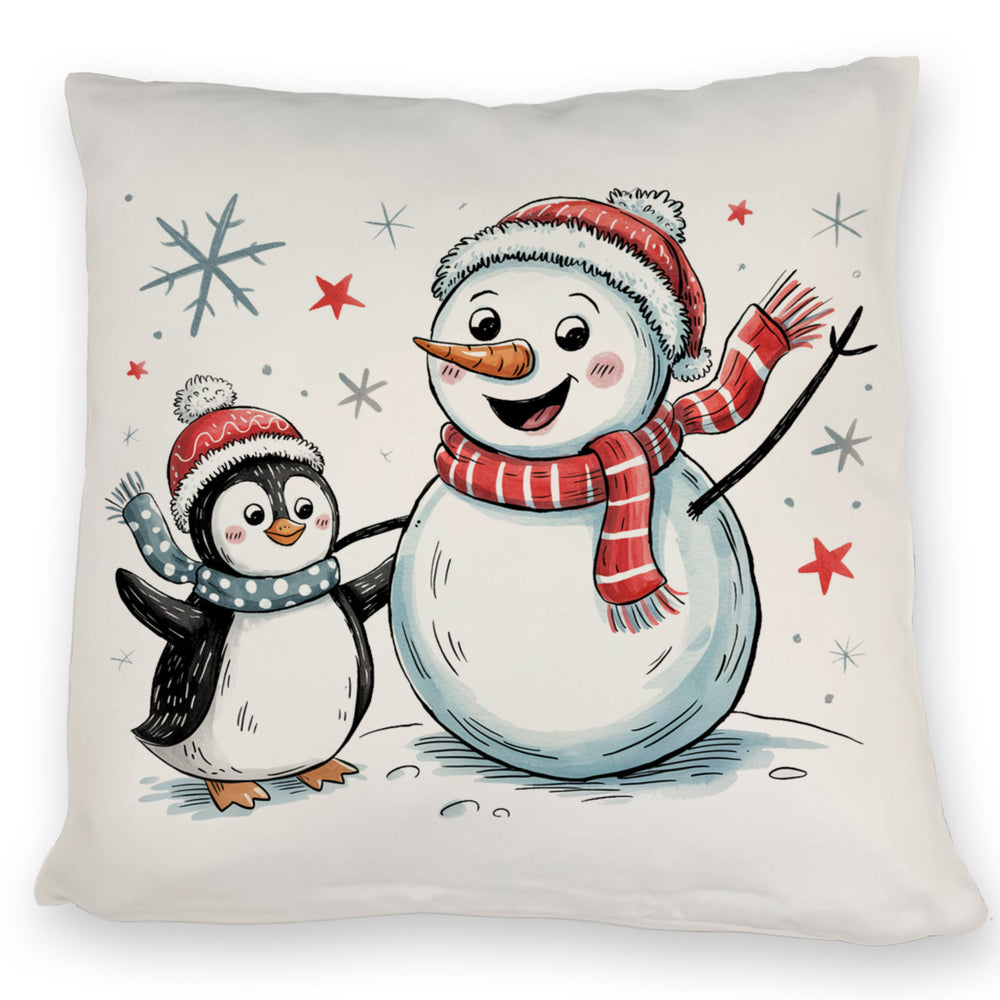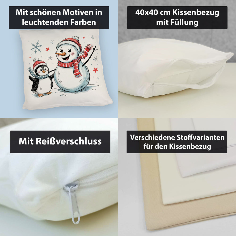 • 1x Schneemann und Pinguin mit Schneeflocken Kissen für Winterliebhaber in der gewählten Ausführung