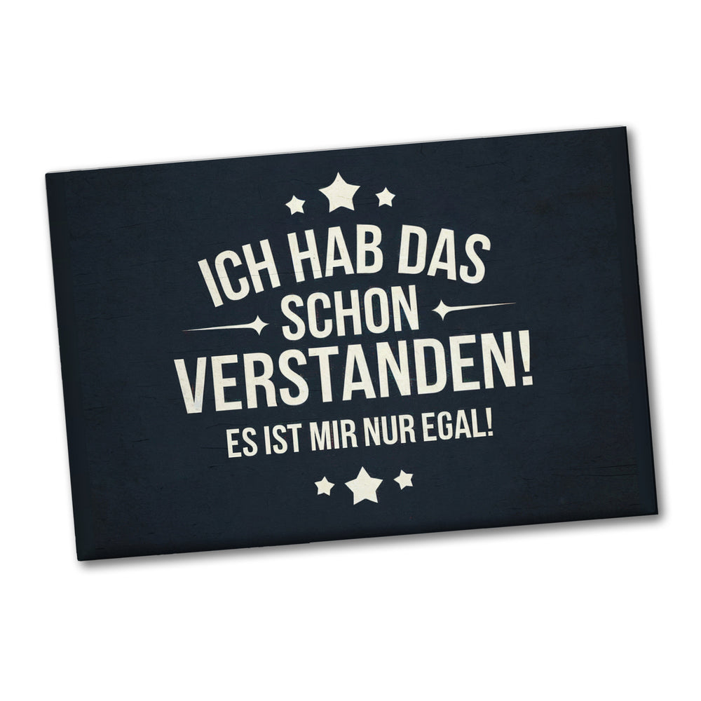 - Du bist ein Meister der Gelassenheit? Dann ist dieser rechteckige Magnet genau das Richtige für dich! Mit seinem dunkelblauen Hintergrund und dem weißen Text "ICH HAB DAS SCHON VERSTANDEN! ES IST MIR NUR EGAL!" bringt er deine lässige Haltung perfekt zum Ausdruck. Drei weiße Sterne runden das witzige Design ab.