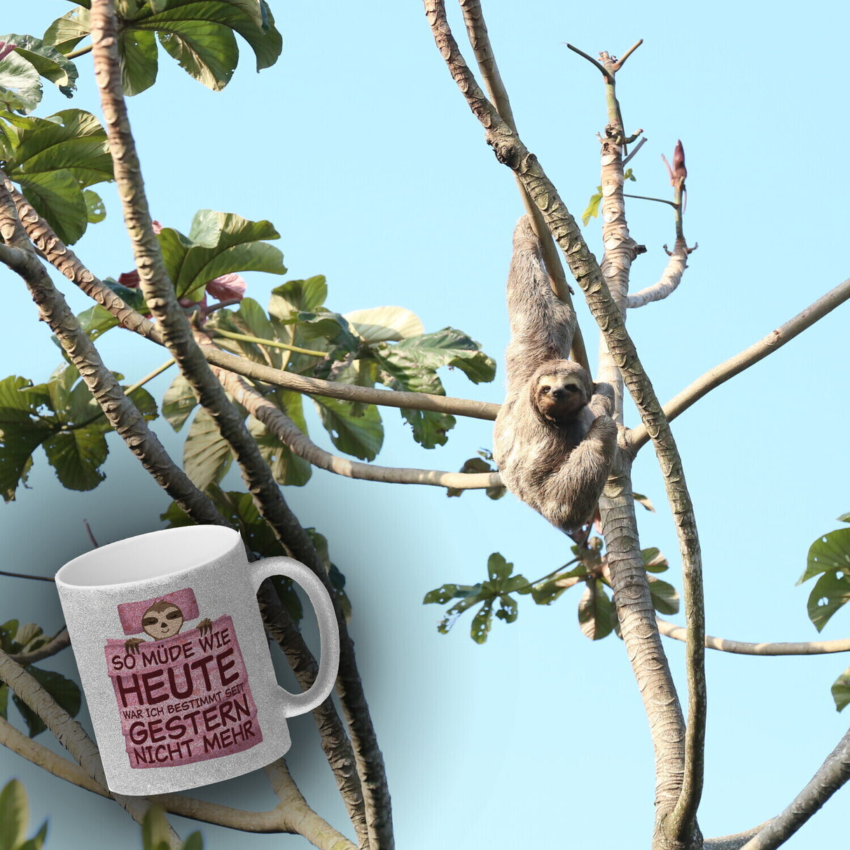 Lustiges Faultiermotiv, witziger Spruch und ein Blickfang im Büro: Mit dem „So müde wie heute war ich seit gestern nicht mehr“ Faultier Kaffeebecher kannst du deine Morgenmuffel-Stimmung ausdrücken und gleichzeitig eine bunte Tasse haben. Erhältlich in verschiedenen Varianten, ob weiße Standardtasse, mit farbigem Henkel und Innenseite oder in der exklusiven Silberedition mit Glitzereffekt. Der hochwertige Druck sorgt dafür, dass die Tasse in lebendigen Farben strahlt. Die Tasse ist perfekt für das Büro geeignet und auch als Geschenk für Kollegen, die sich über Müdigkeit beschweren, eine gute Wahl. Erlebe den Genuss deines Lieblingsgetränks direkt aus dieser witzigen Tasse!