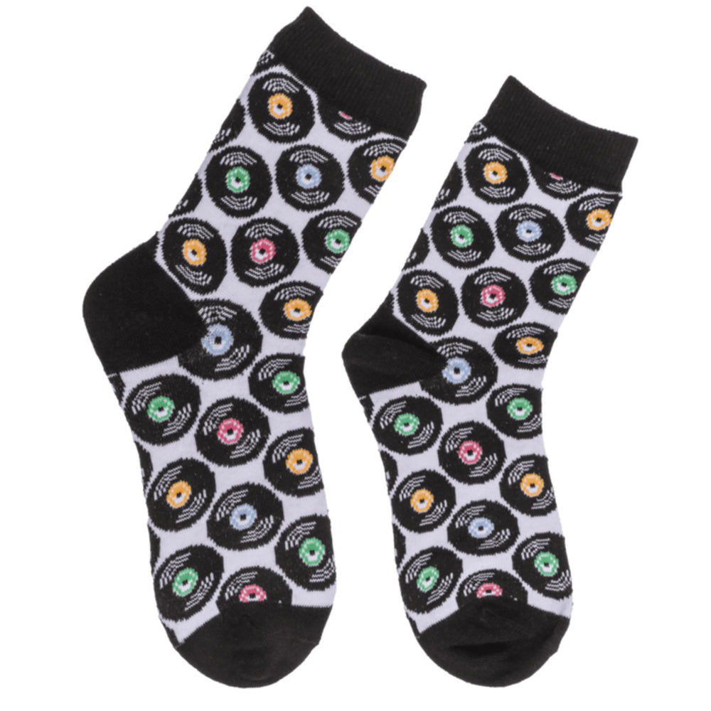 - Diese Socken sind überwiegend weiß mit stilvollen schwarzen Details an Bund, Ferse und Fußspitze. Sie sind mit bunten Vinyl Plattenmotiven verziert, die nostalgische Erinnerungen an Plattenspieler wecken. Ein Design, das Aufmerksamkeit auf sich zieht und gleichzeitig bequem ist!