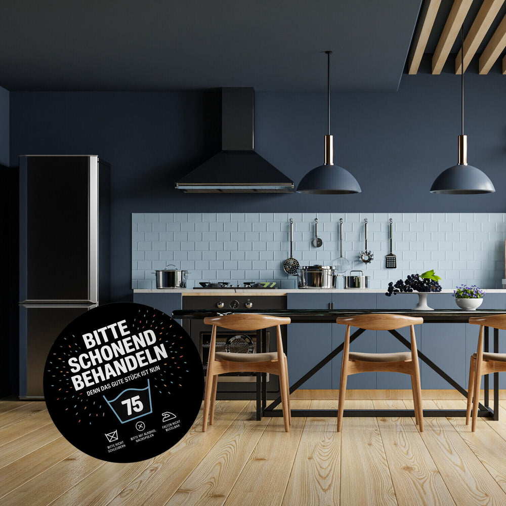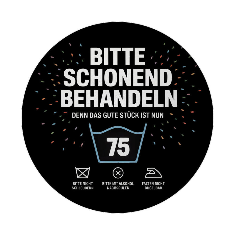 - Dieser lustige Kühlschrankmagnet zeigt ein hellblaues Wäschesymbol mit der großen '75' in der Mitte, umgeben von witzigen Symbolen und einem fetten, weißen Text 'BITTE SCHONEND BEHANDELN'. Bunte konfettiartige Punkte in Rot, Blau, Grün und Lila setzen fröhliche Akzente und bringen Leben in Ihre Küche oder Waschküche.