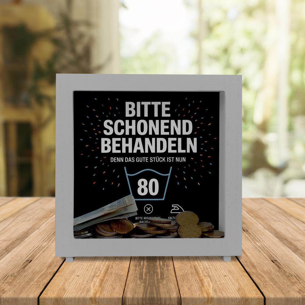- 1x Wäschepflegeetikett Spardose bitte schonend behandeln wird 80 in der gewählten Ausführung