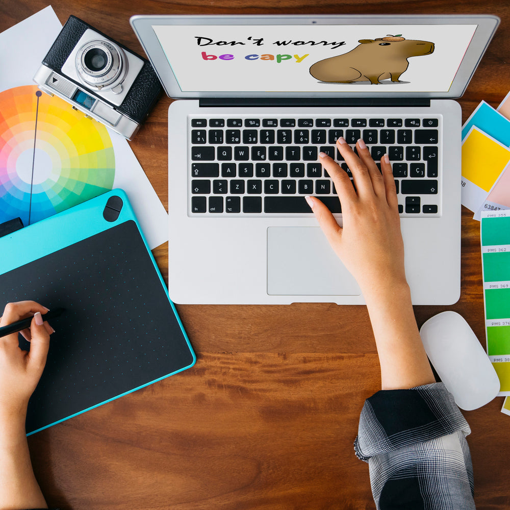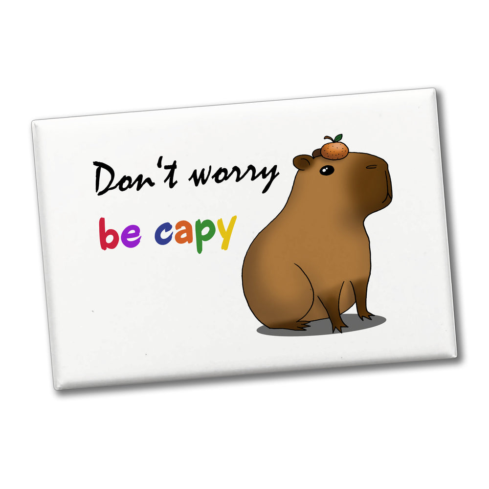 • Auf dem Magneten steht der lustige Spruch: Don’t worry be capy. Als Motiv ist ein süßes Capybara mit Mandarine auf dem Kopf zu sehen.
