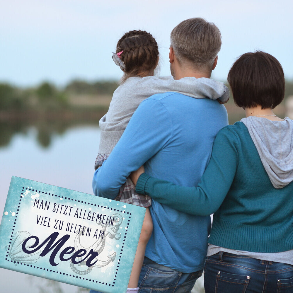 • Auf dem Magneten steht der lustige Spruch: Man sitzt allgemein viel zu selten am Meer. Als Motiv ist ein nautischer Anker und eine Muschel zu sehen. Der Hintergrund ist weiß-hellblau.