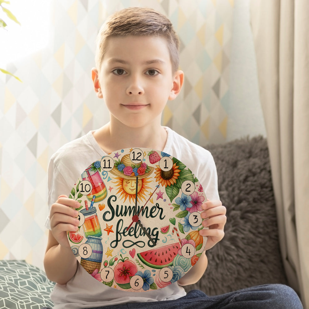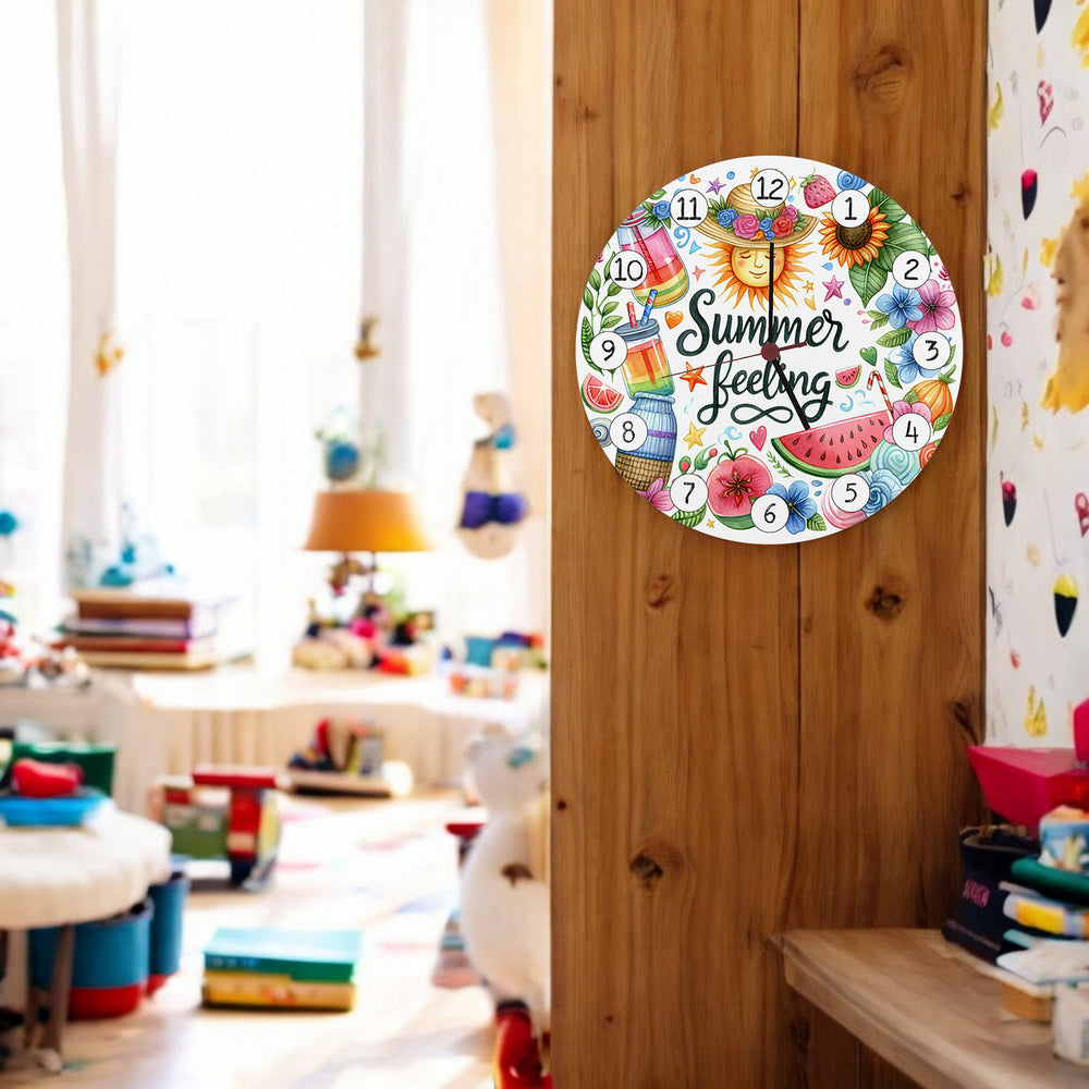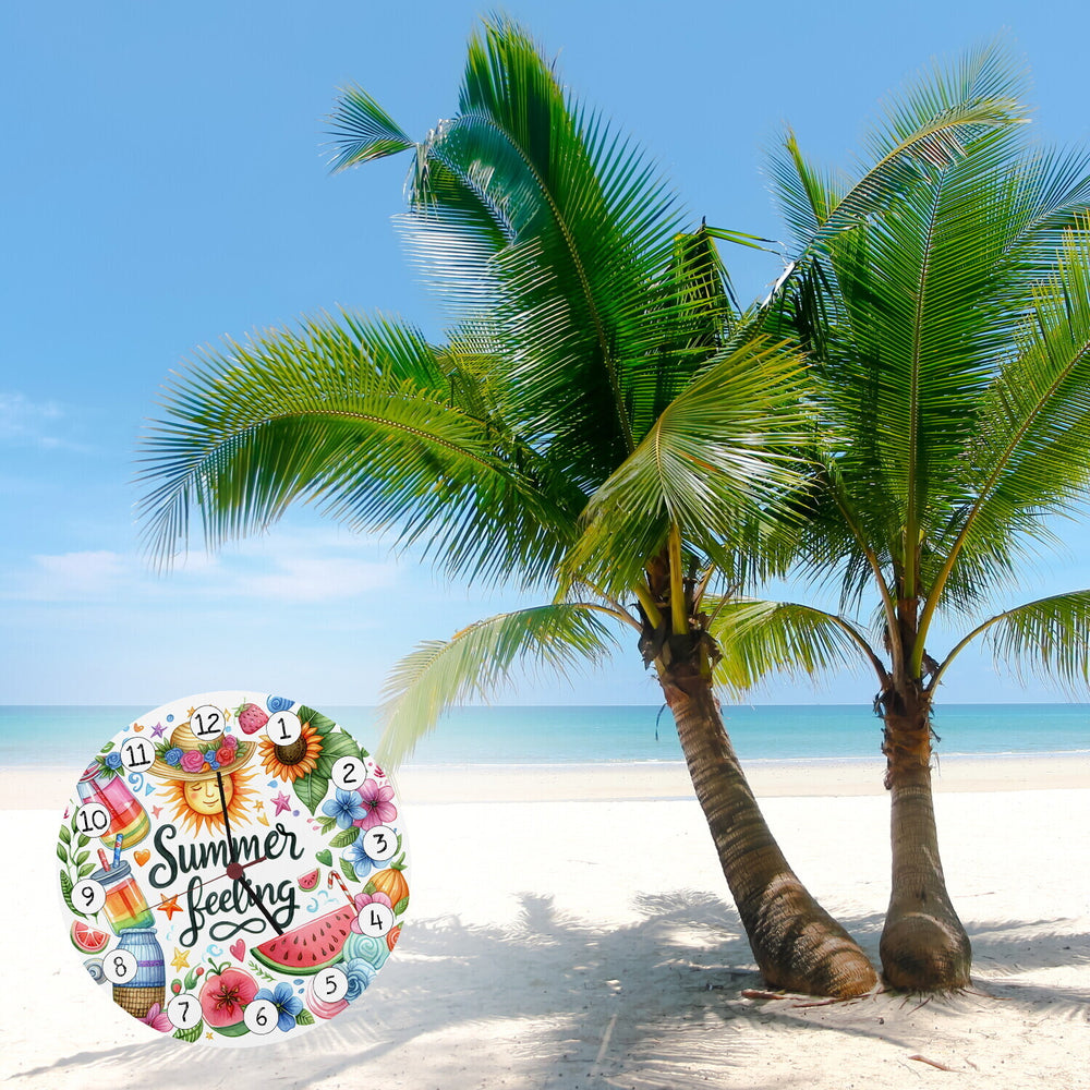 - Die Sonne und Sommer Wanduhr bringt echtes Sommer feeling in jede Ecke deines Zuhauses! Mit buntem Text und sommerlichen Motiven wie Sonnen, Palmen und Eiscreme strahlt die Uhr pure Lebensfreude aus. Perfekt für alle, die das helle und lebendige Gefühl des Sommers lieben.
