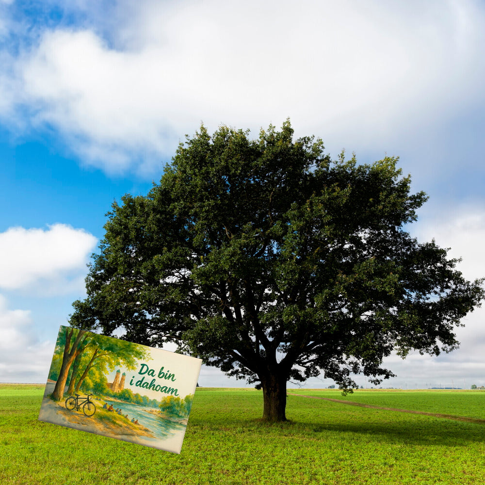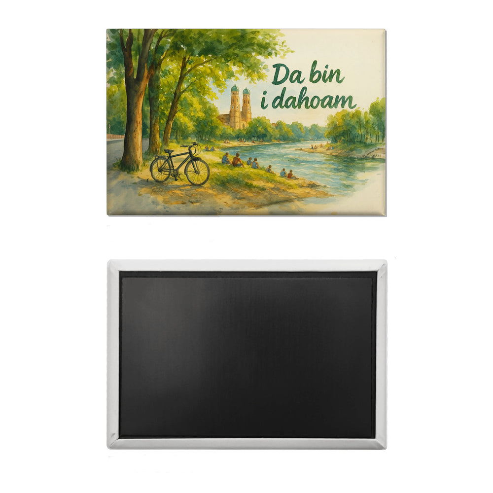 • Der Souvenir-Magnet schimmert in Aquarellfarben und zeigt die ikonische Münchner Frauenkirche mit ihren markanten Zwillingstürmen. Ein Fahrrad lehnt lässig am Baumstamm, der sich stolz vor einem warmen, sommerlichen Isarufer erhebt. Der Spruch "Da bin i da hoam" prangt in dunkelgrüner Schrift und versprüht bayrischen Charme.