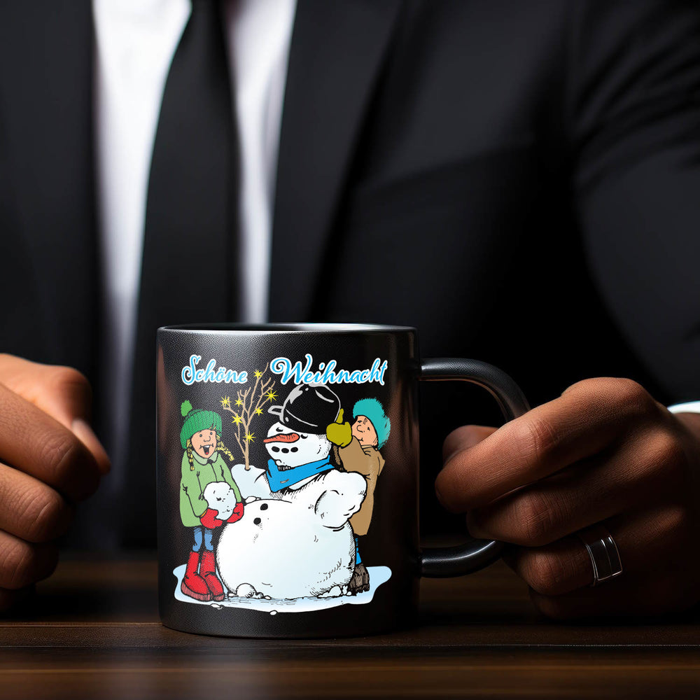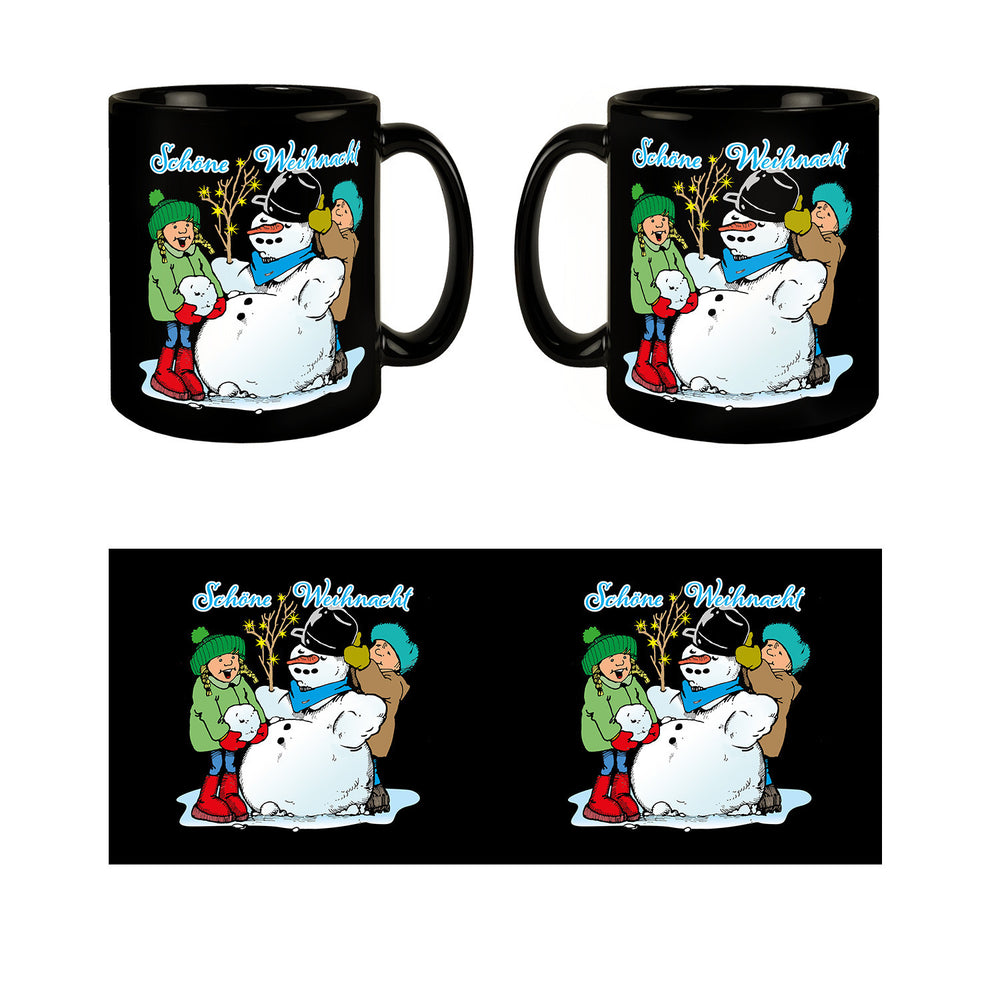 Diese schwarze Tasse zeigt ein frohes Winterbild mit zwei lachenden Kindern im Schnee, die einen lustigen Schneemann gebaut haben. Der Schneemann trägt stolz einen Zweig mit funkelnden Sternen. Der Schriftzug "Schöne Weihnacht" macht die Tasse zum Hinweise: Fassungsvermögen: ca. 300ml