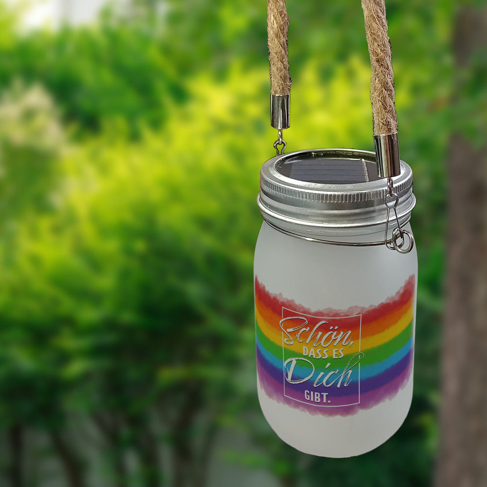 Bereit, jemandem den Tag zu erhellen? Unser „Schön, dass es Dich gibt“ Solarlicht mit Regenbogen ist genau das, was Sie brauchen! Dieses bezaubernde Lichtkunstwerk verbindet die Magie der Farben mit einer herzlichen Botschaft - perfekt für all die besonderen Menschen in Ihrem Leben. Stellen Sie es an einen sonnigen Ort, lassen Sie die Sonne tun, was sie am besten kann, und erleben Sie, wie es am Abend bis zu 12 Stunden sanft und einladend leuchtet.Mit 40 LEDs im Deckel bringt diese Solarlampe jeden Raum zum Strahlen und ist mit ihrem dekorativen Seil kinderleicht aufzuhängen, drinnen oder draußen. Egal, ob auf dem Balkon, im Wohnzimmer oder im Büro, die harmonischen Aquarellfarben sind ein garantierter Blickfang und die Botschaft „Schön, dass es Dich gibt“ sorgt für ein wohliges Gefühl im Herzen.Dieses Solarlicht ist das ideale Geschenk für Geburtstage, Jahrestage oder einfach, um Danke zu sagen. Es ist ein Ausdruck reiner Wertschätzung und spendet sowohl Licht als auch Freude, ganz ohne Strom, nur mit der Kraft der Sonne. Also, warum warten? Bereiten Sie jemandem ein Lächeln und schenken Sie ein Stück Glück! Einfach bezaubernd - einfach perfekt!
