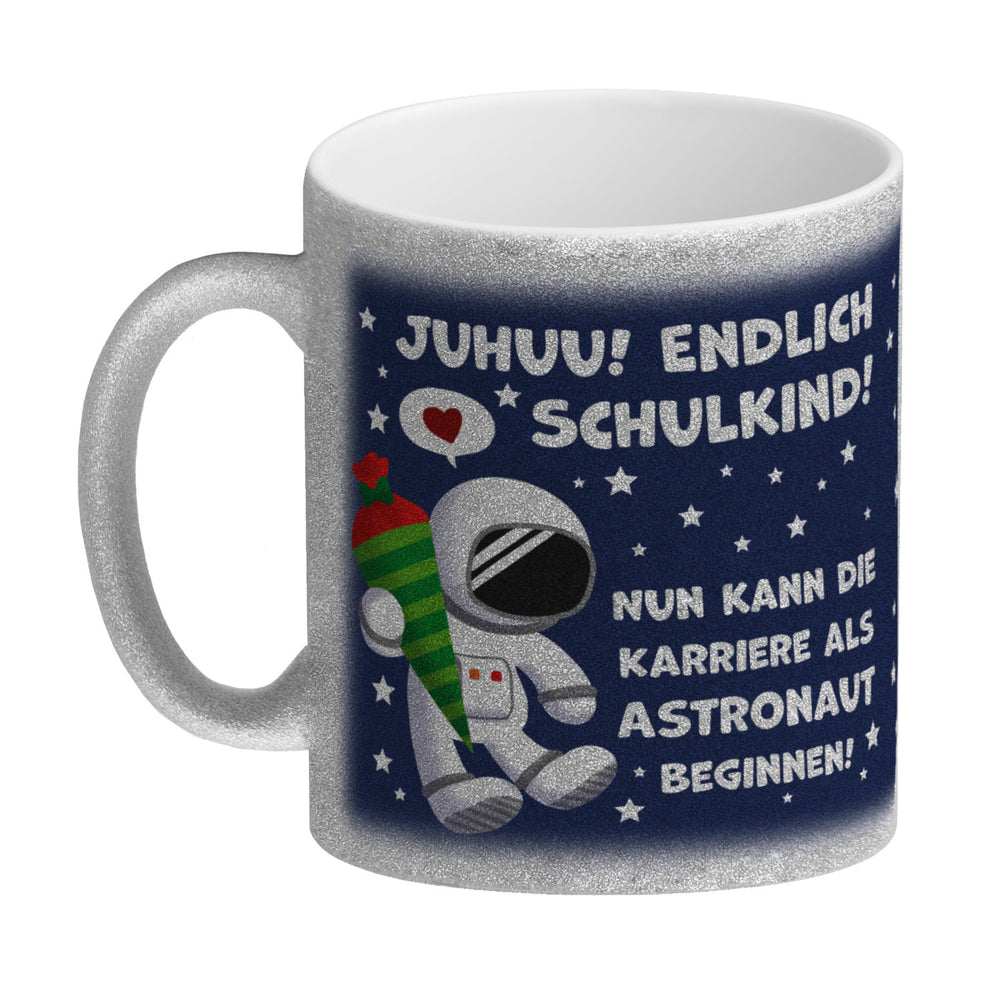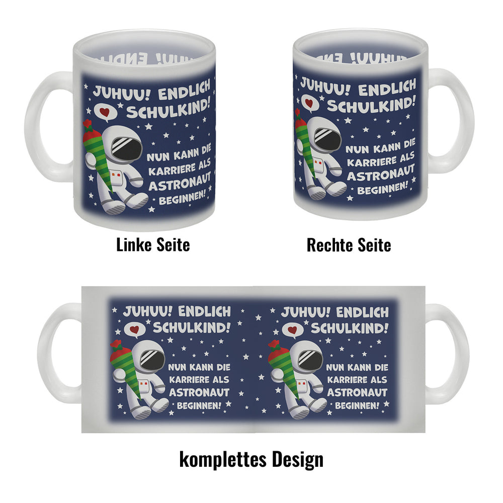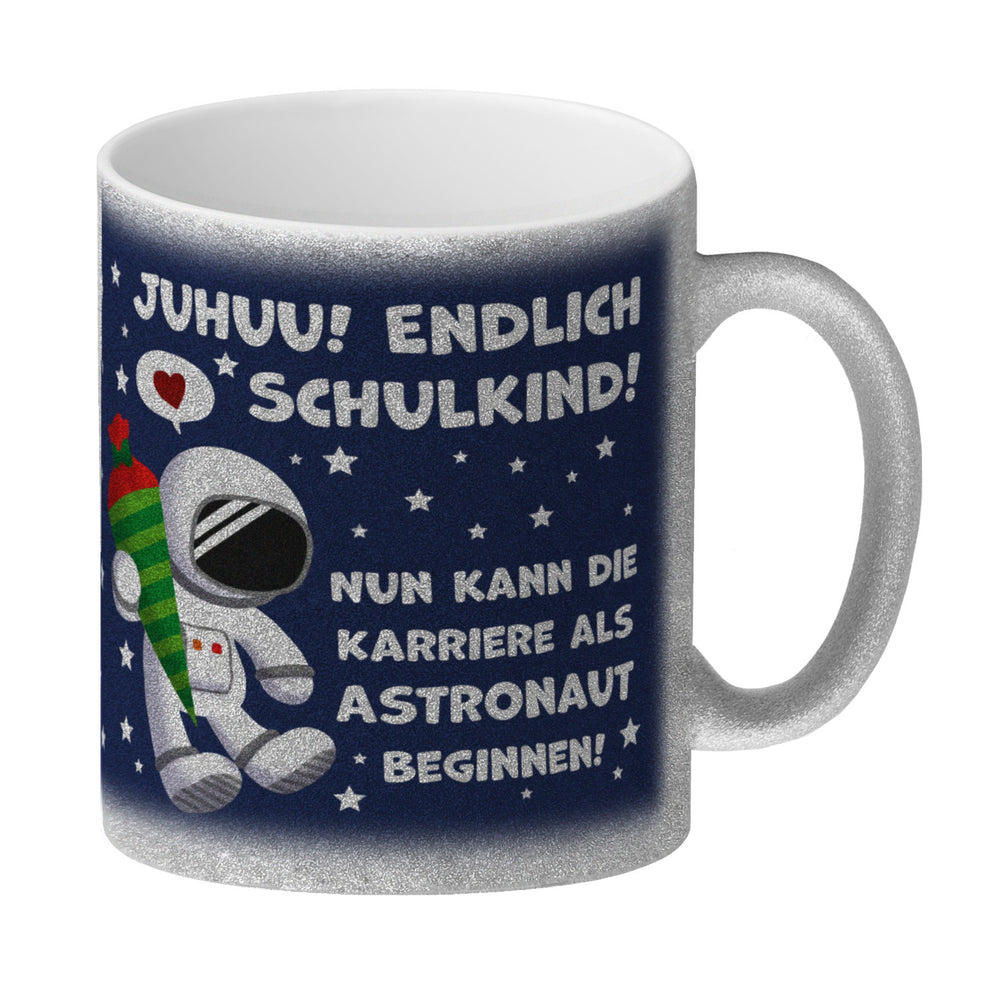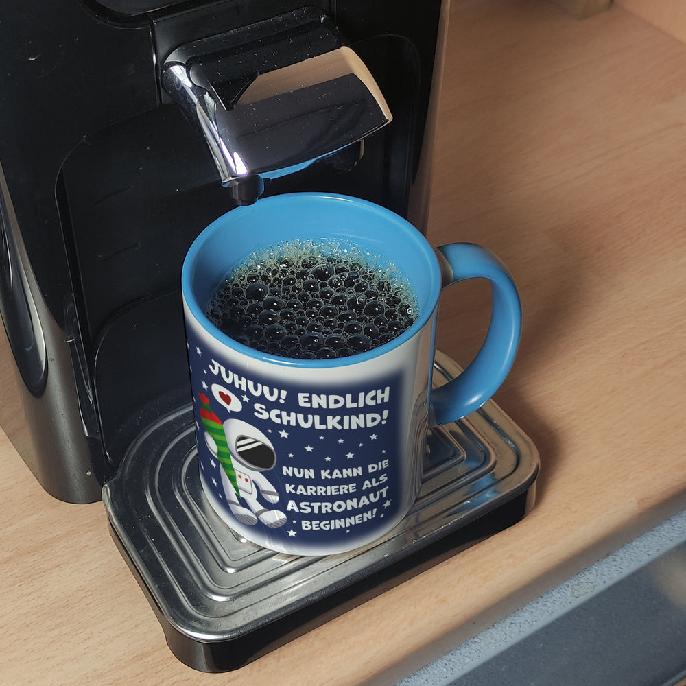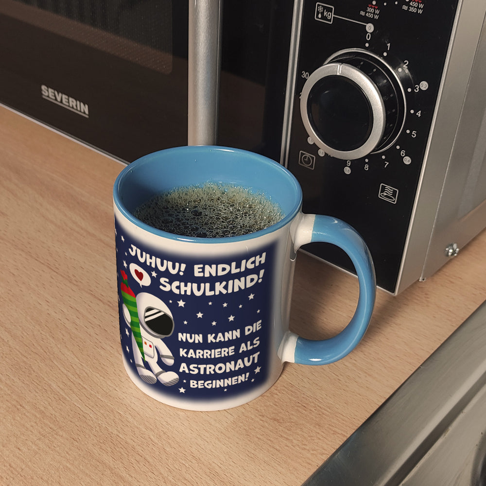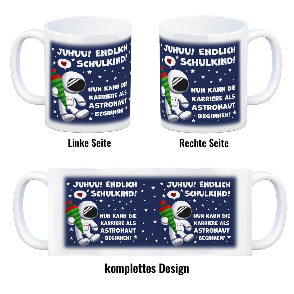 - 1x Juhuu endlich Schulkind Astronaut Kaffeebecher zur Einschulung in der gewählten Ausführung