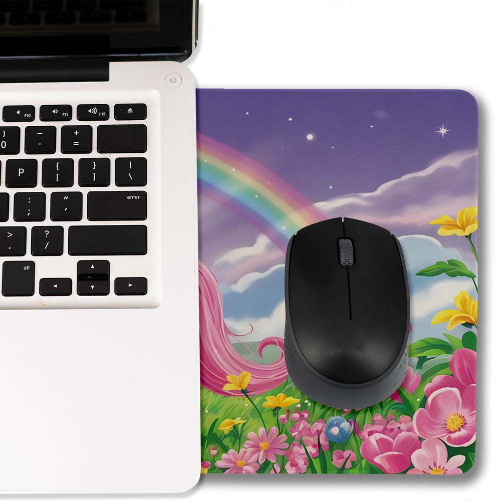 • Willkommen in der Welt der Fantasie! Unsere Schreibtischunterlage zeigt ein majestätisches Einhorn, das auf einer üppigen Blumenwiese steht. Der Traum aus Rosa, Lila und Weiß wird durch einen funkelnden Regenbogen gekrönt. Die zarten Pastellfarben und Details machen diese Illustration zu einem echten Hingucker für jeden Schreibtisch.
