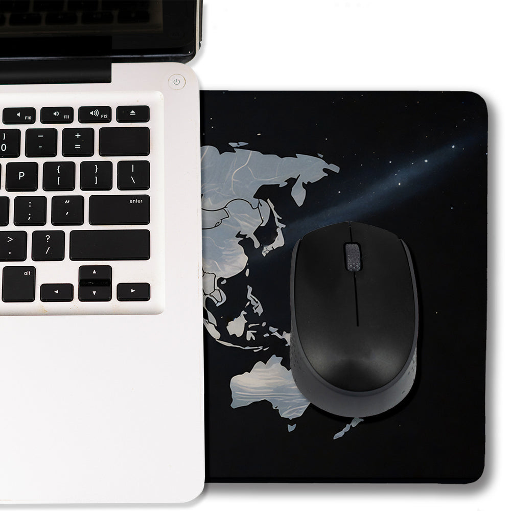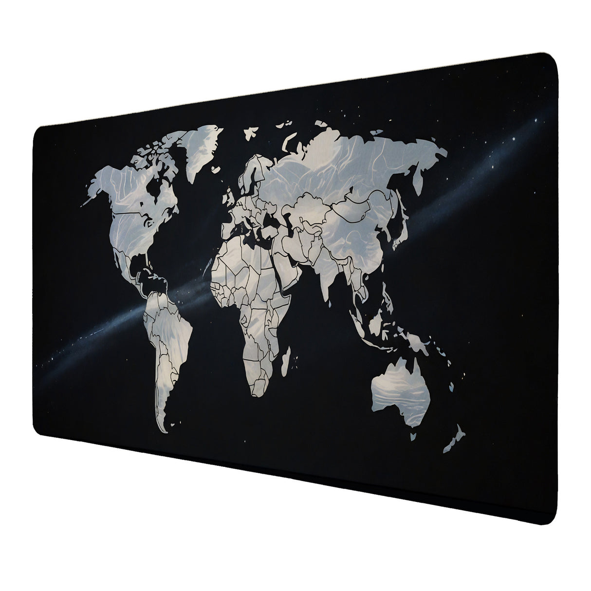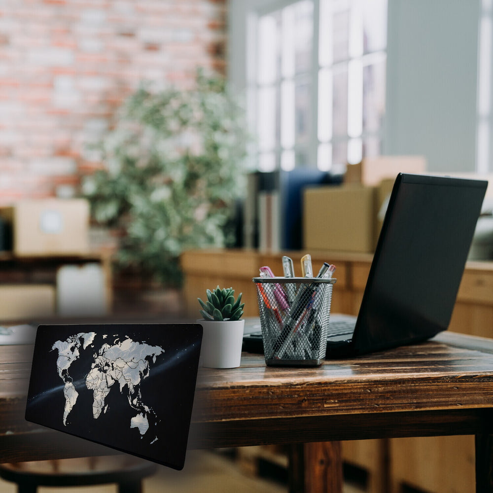 - Diese Schreibtischunterlage ist ein Must-Have für jeden Geographie-Fan! Mit einem eleganten schwarzen oder dunkelgrauen Hintergrund und einer silbernen Weltkarte verleiht sie deinem Schreibtisch einen Hauch von kosmischer Eleganz. Präzise Linien zeigen die Kontinente und Küstenlinien, umrahmt von einem stillen, sternenklaren Nachthimmel.