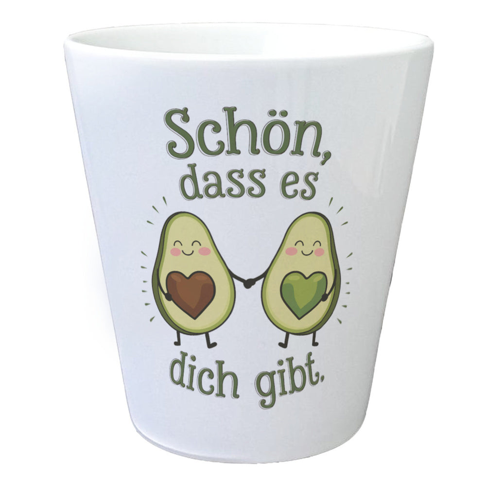 - Stell dir vor, zwei fröhliche Avocados mit herzförmigen Kernen schmücken deinen Raum! Eine hat einen braunen, die andere einen grünen Kern. Händchen haltend strahlen sie mit dem süßen Spruch "Schön, dass es Dich gibt" auf einem weißen Blumentopf. Die kleinen Punkte rundherum verleihen dem Design einen verspielten Touch.