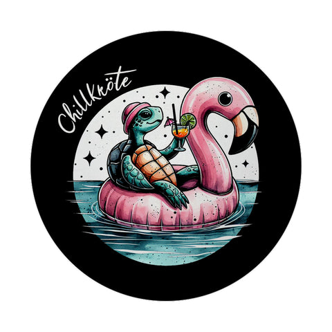 Schildkröte auf Flamingo-Schwimmring Magnet rund mit Spruch Chillkröte