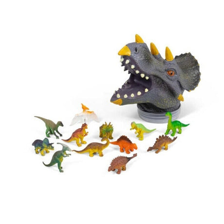 Dinosaurier Spielfiguren in einem Triceratops Kopf im 12er Set