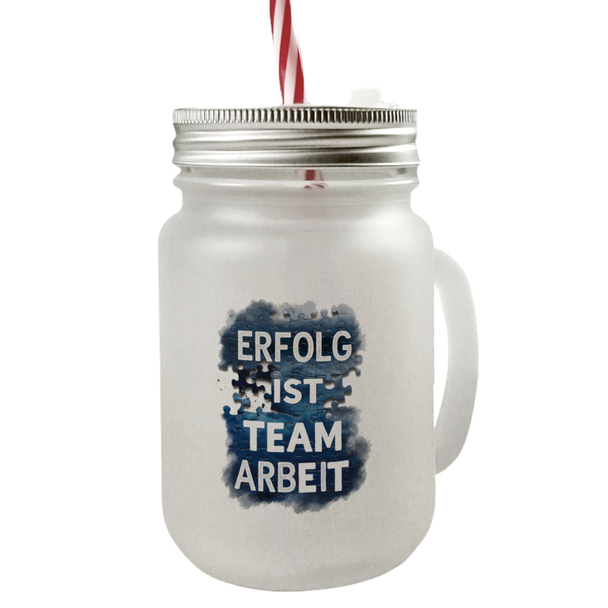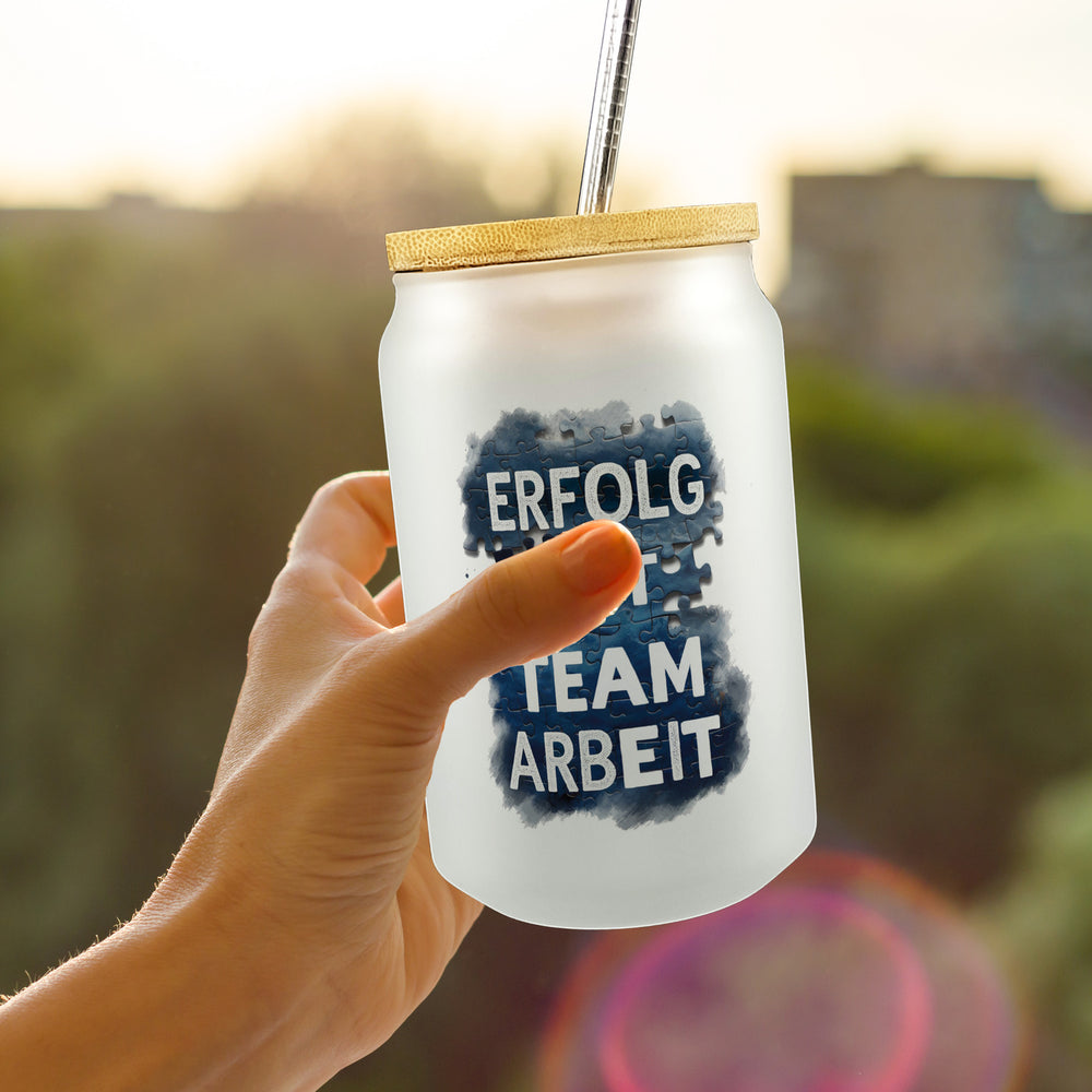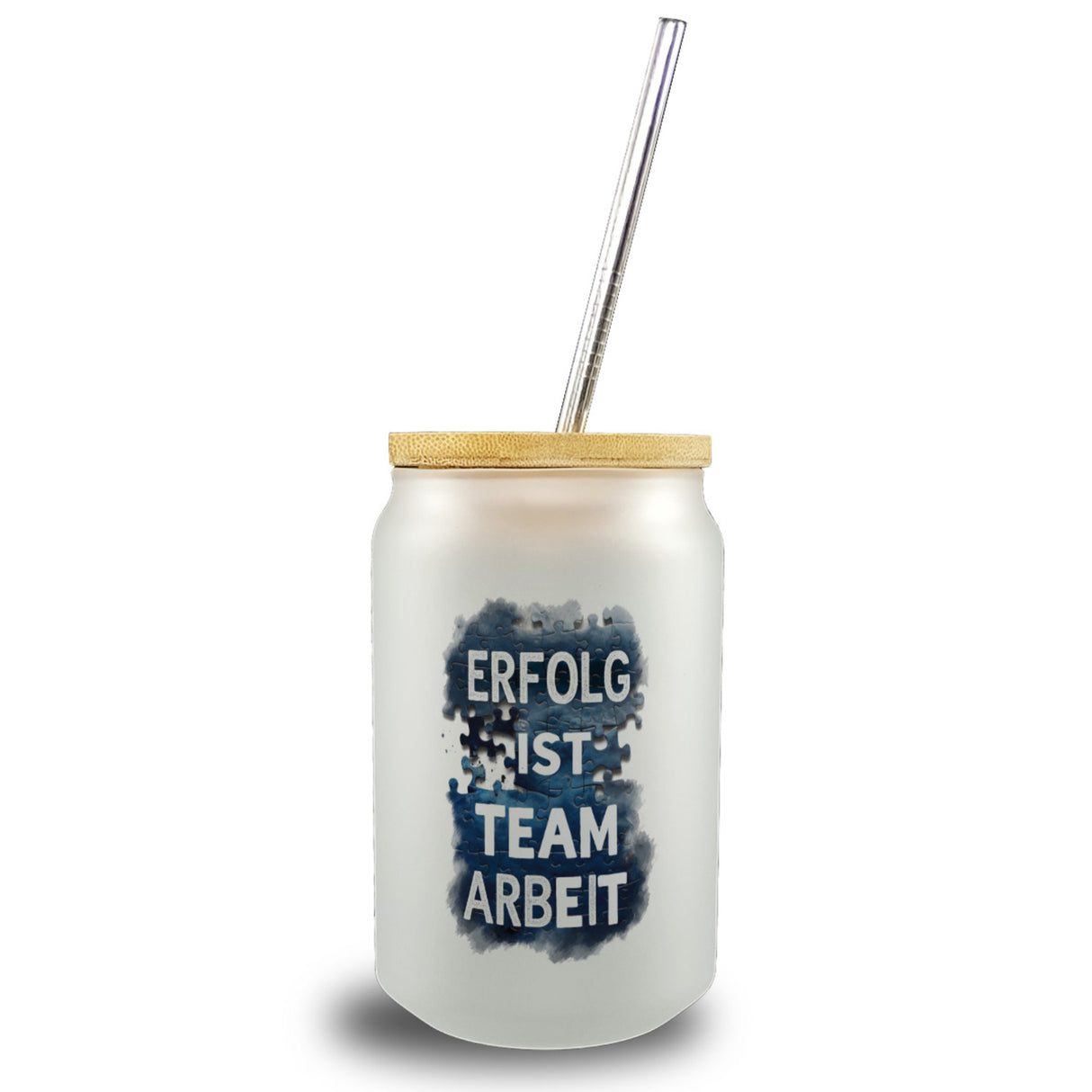 - 1x Erfolg ist Teamarbeit Trinkglas mit Bambusdeckel Typografisches Aquarell mit Bambusdeckel oder Henkel