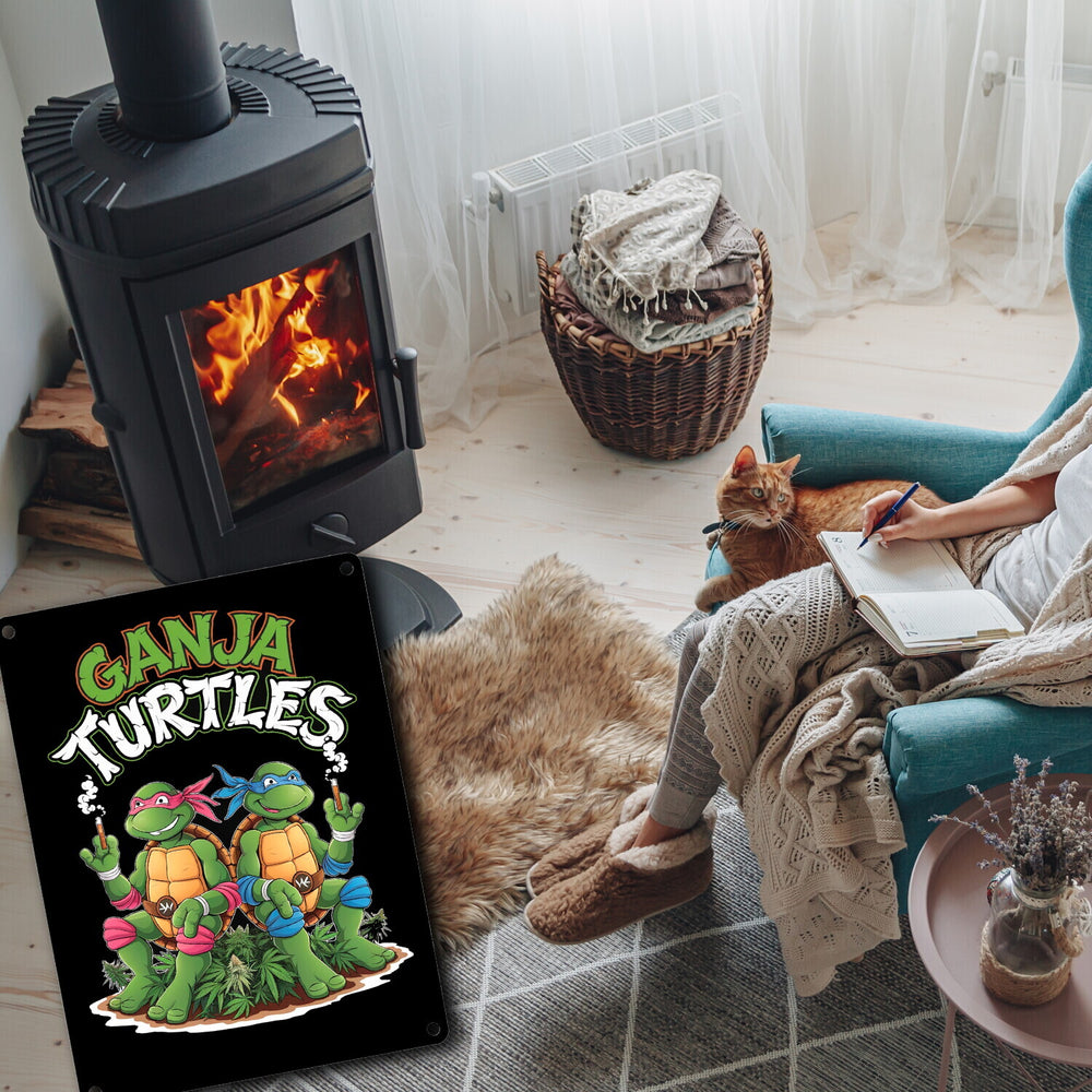 - Hol dir jetzt das hochwertig bedruckte 'Ganja Turtles' Metallschild und verpasse deinem Raum einen Hauch von Spaß und Stil! Mit Liebe designt und in bester Qualität gefertigt, ist es das perfekte Dekoelement für jeden, der Humor und Cannabis-Lifestyle schätzt. Lass die bekifften Schildkröten bei dir einziehen!