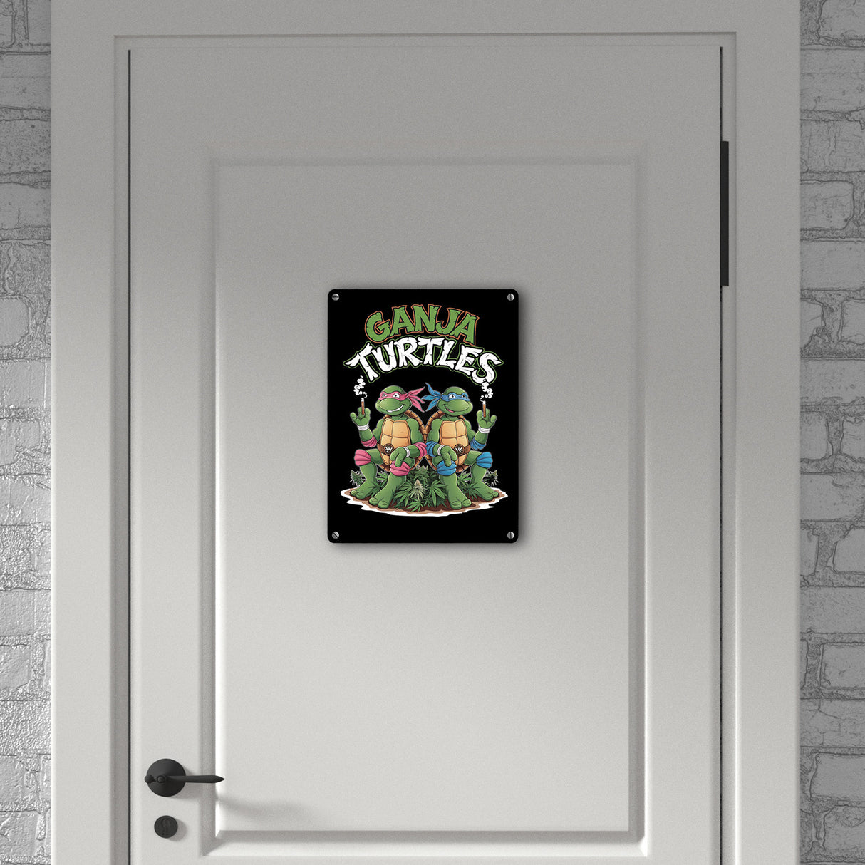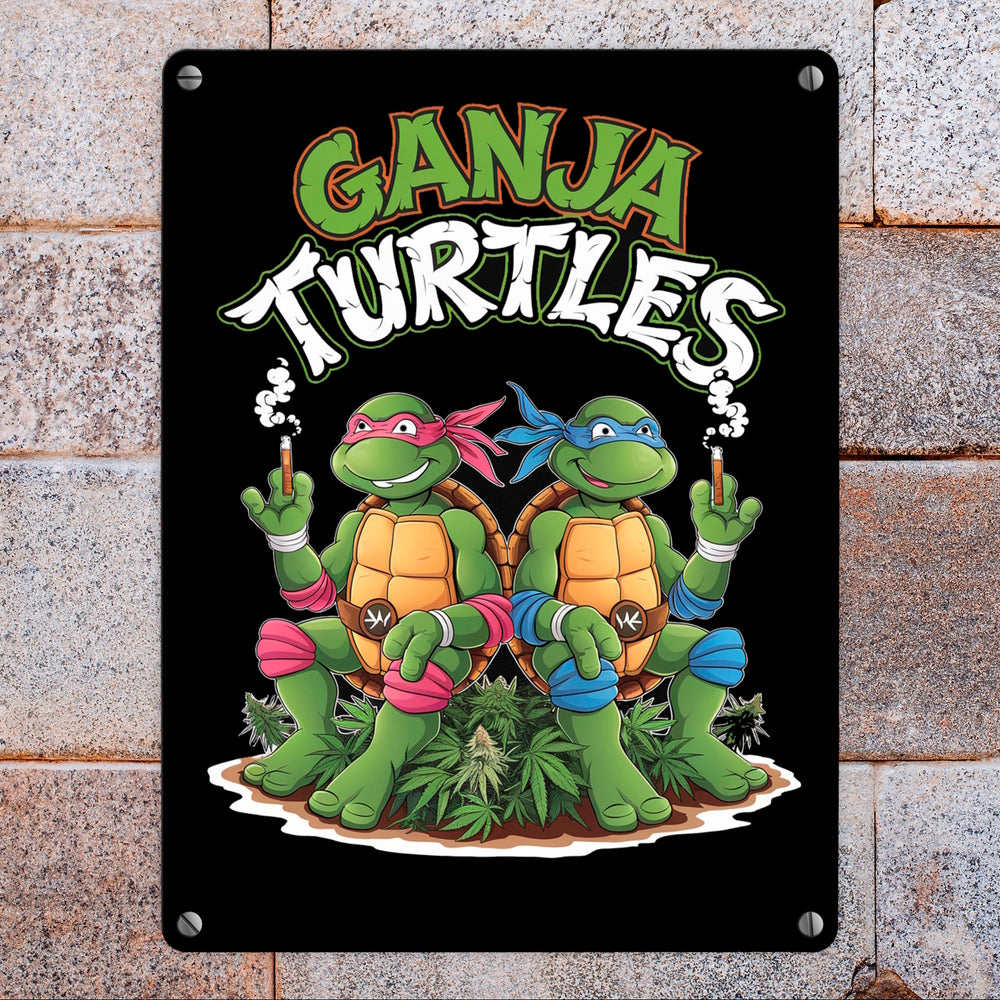 - Dieses Metallschild zeigt die 'Ganja Turtles' in einer fröhlichen Kiffer-Laune! Unsere bekifften Schildkröten rocken mit Sonnenbrillen, bunten Bandanas und einem fetten Joint. Umgeben von grünen Cannabispflanzen, prangt der Schriftzug 'Ganja Turtles' in leuchtenden Grün- und Weißtönen auf einem schwarzen Hintergrund. Der perfekte Hingucker für jede Wand!