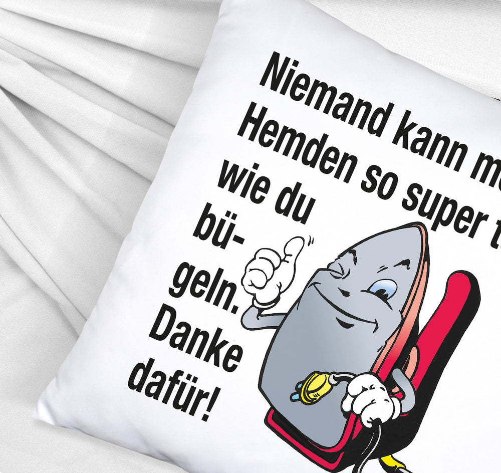 Lächelndes Bügeleisen Kissen mit Spruch: Niemand bügelt Hemden besser. Danke!