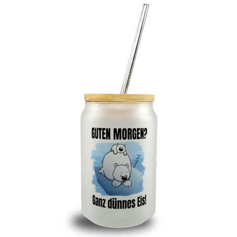 Eisbär Trinkglas mit Bambusdeckel mit Spruch Guten Morgen? Ganz dünnes Eis