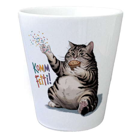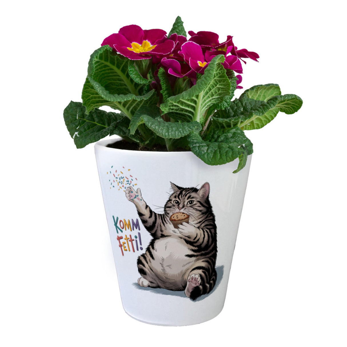 Der Pummelige Katze Blumentopf zeigt ein bezauberndes Design mit einer pummeligen Katze, die genüsslich einen Cupcake hält und fröhlich bunte Konfetti in die Luft schleudert. Mit ihrem gestreiften grau-weißen Fell und dem verspielten 'Komm Fetti!' Schrift Hinweise: Material: Keramik / Höhe: ca. 10 cm, Durchmesser oben: ca. 9cm / Mit Bodenloch zur Vermeidung von Staunässe.