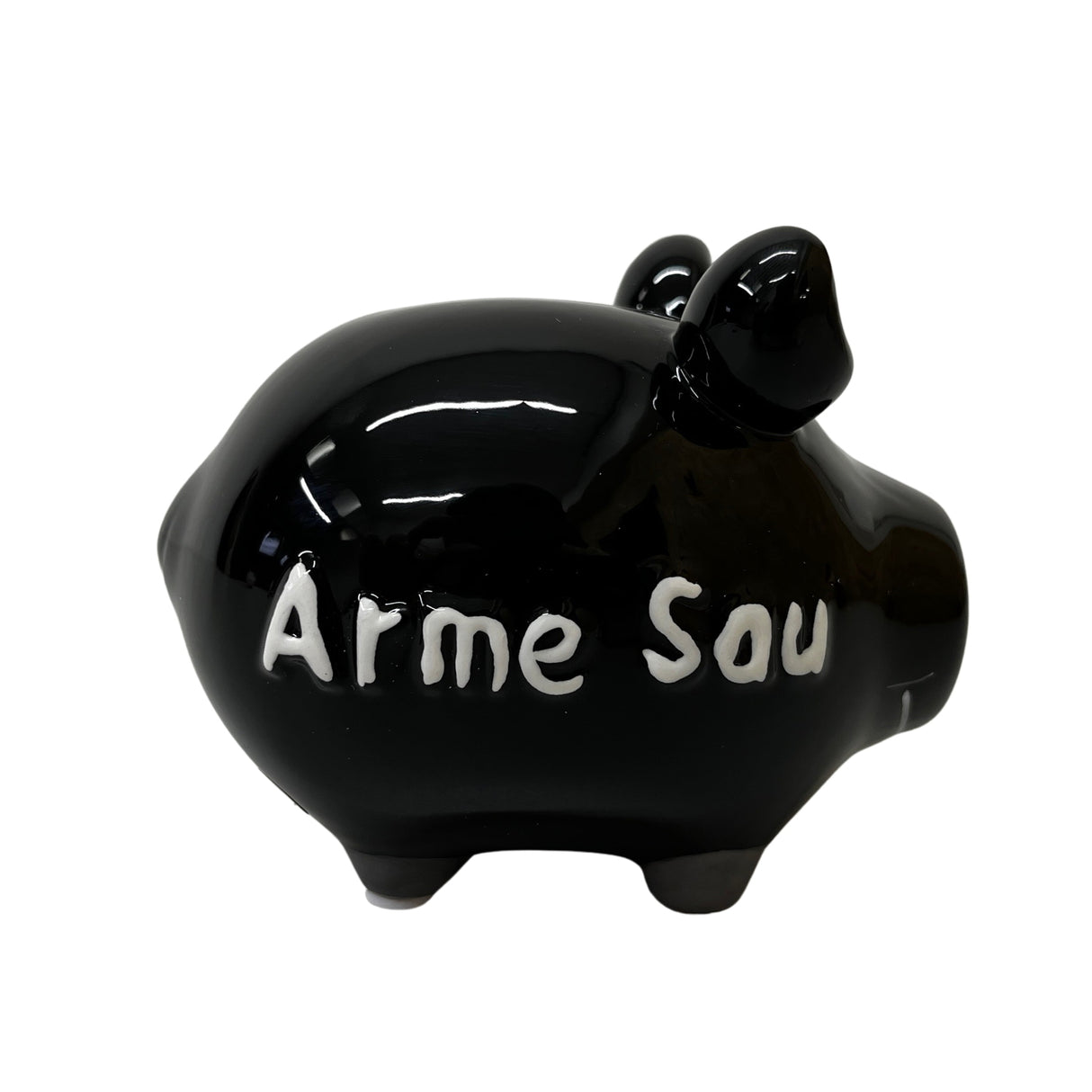 Bringen Sie Ihr Geld in Sicherheit und lassen Sie es wachsen! Mit dem &quotArme Sau&quot Sparschwein aus Keramik sichern Sie Ihre Einsparungen. Er ist stabil und robust, hat eine Größe von ca. 13 cm x 10 cm x 9,5 cm und ein Gewicht von ca. 200g. Mit seinem schwarzen Glanz, den weißen Details sowie der Aufschrift an beiden Seiten ist er nicht nur ein praktisches Sparwerkzeug, sondern auch ein auffälliges Deko-Element für jeden Raum. Zudem kann es mehrmals verwendet werden, da es über eine Öffnung am Boden verfügt. Machen Sie Ihren Finanzen eine Freude und holen Sie sich jetzt das &quotArme Sau&quot Sparschwein!